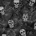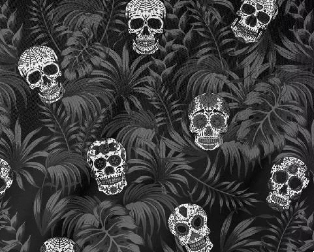 Tissu polyester tête de mort noir gris et blanc. Il ne se froisse pas