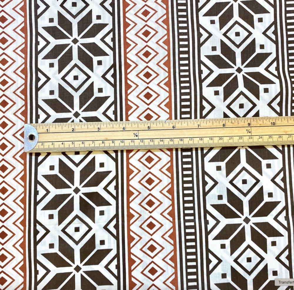 Tissu 100% coton imprimé style scandinave marron, beige et orange.