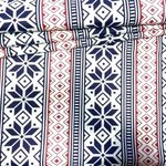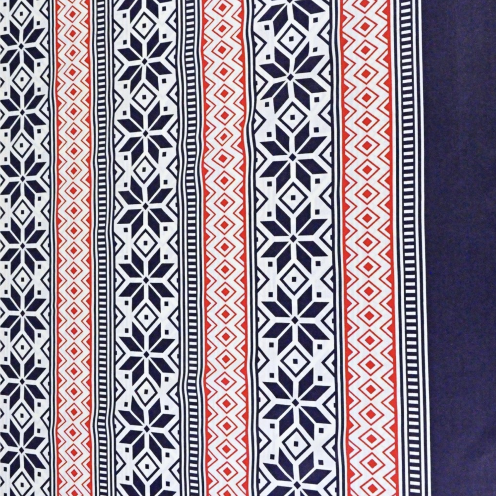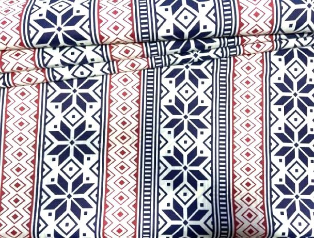 Tissu 100% coton imprimé style scandinave bleu marine, beige et rouge.