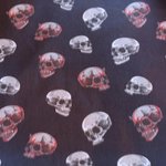 Tissu 100% coton noir avec des têtes de mort blanches et rouge dessus.