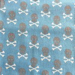 Tissu 100% coton bleu avec des petites têtes de mort blanches et grises de 3cm de hauteur.