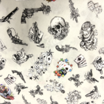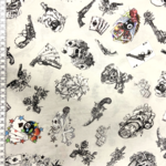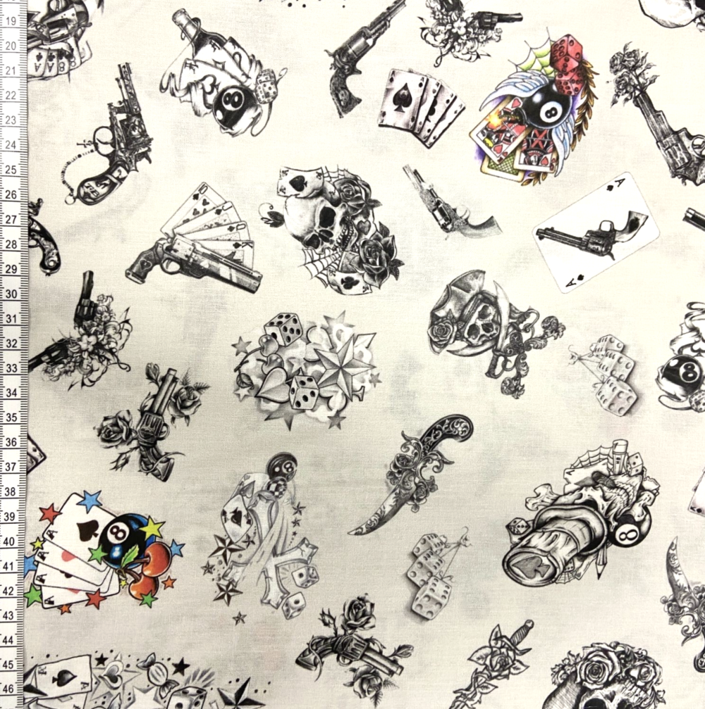 Tissu 100% coton blanc /beige avec des têtes de mort, des pistolets et des jeux de cartes