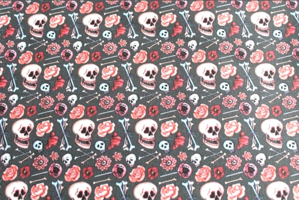 Tissu 100% coton gris avec des têtes de mort de 2.5cm colorées