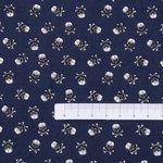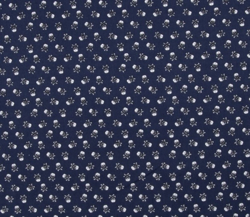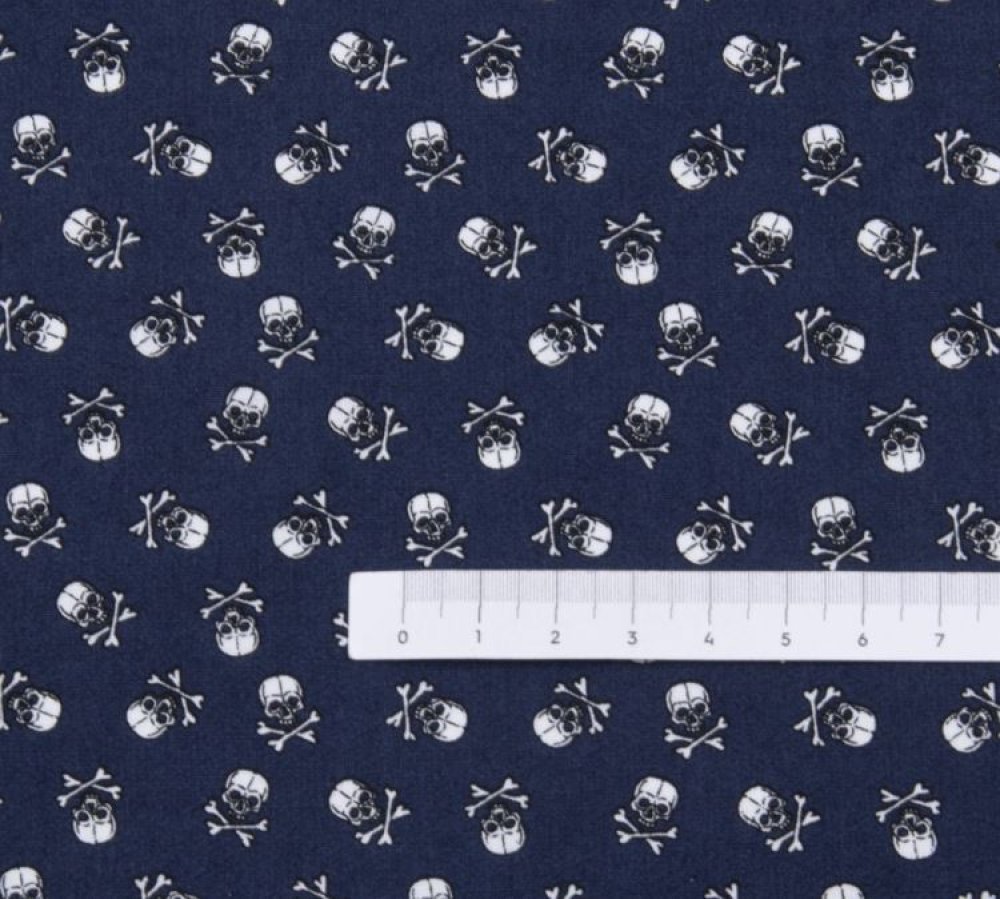 Tissu 100% coton bleu marine avec des têtes de mort blanches de 1 cm dessus.