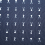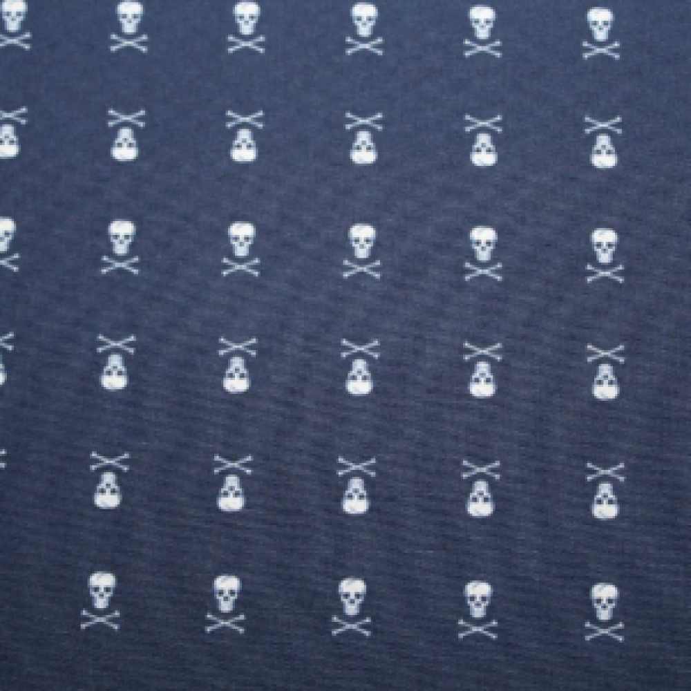Tissu 100% coton bleu marine avec des petites têtes de mort blanches de 1cm de hauteur dessus.