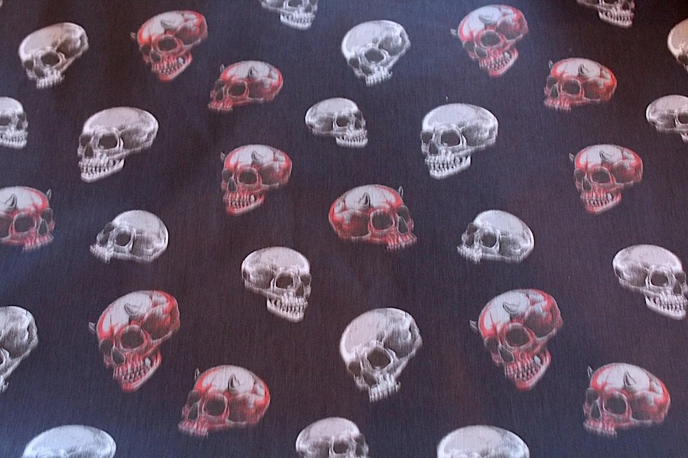 Tissu 100% coton noir, rouge et blanc avec des têtes de mort