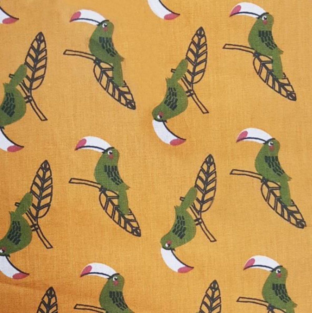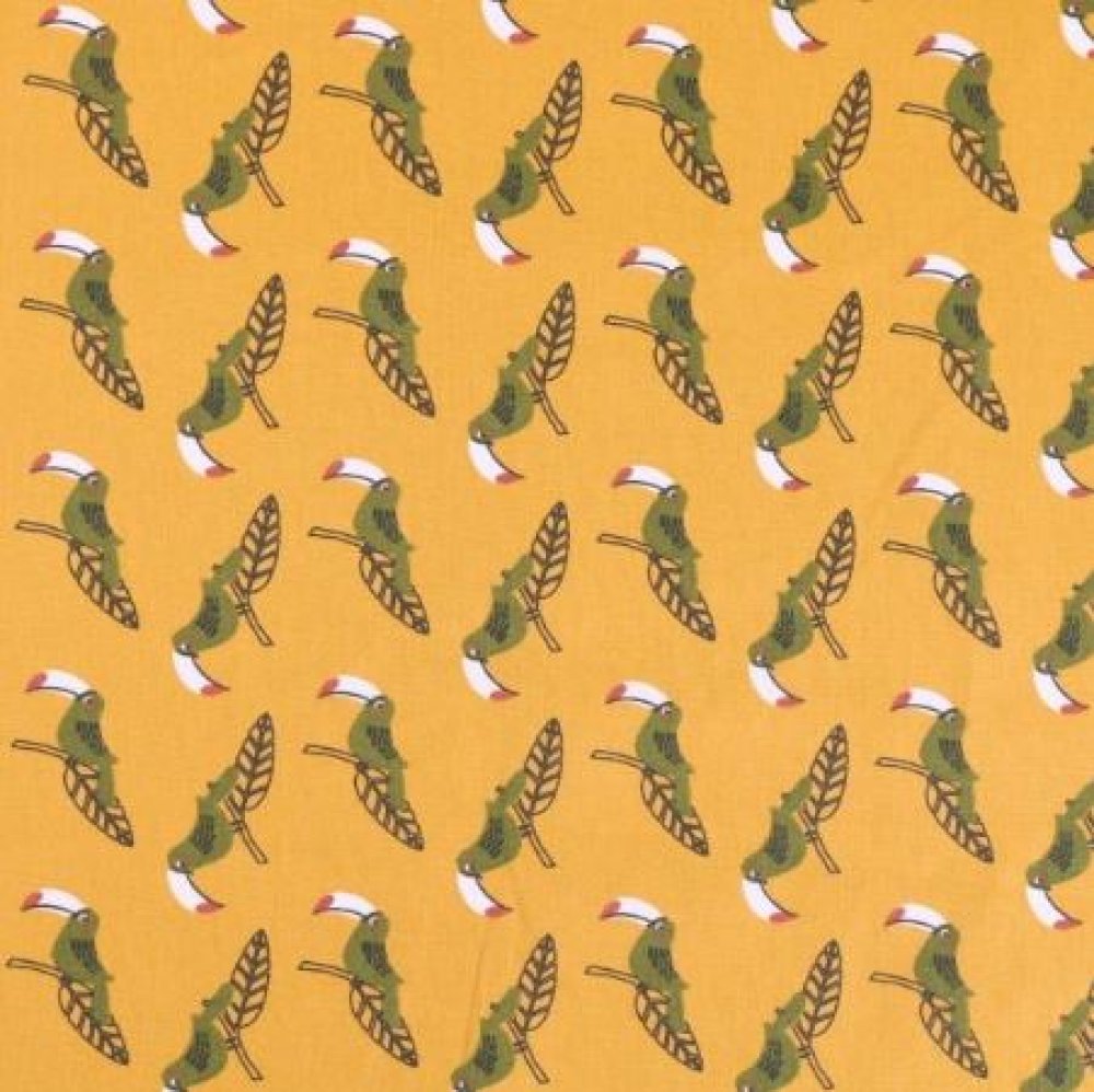 Tissu 100% coton moutarde avec des toucans vert pour un rendu tropical très tendance