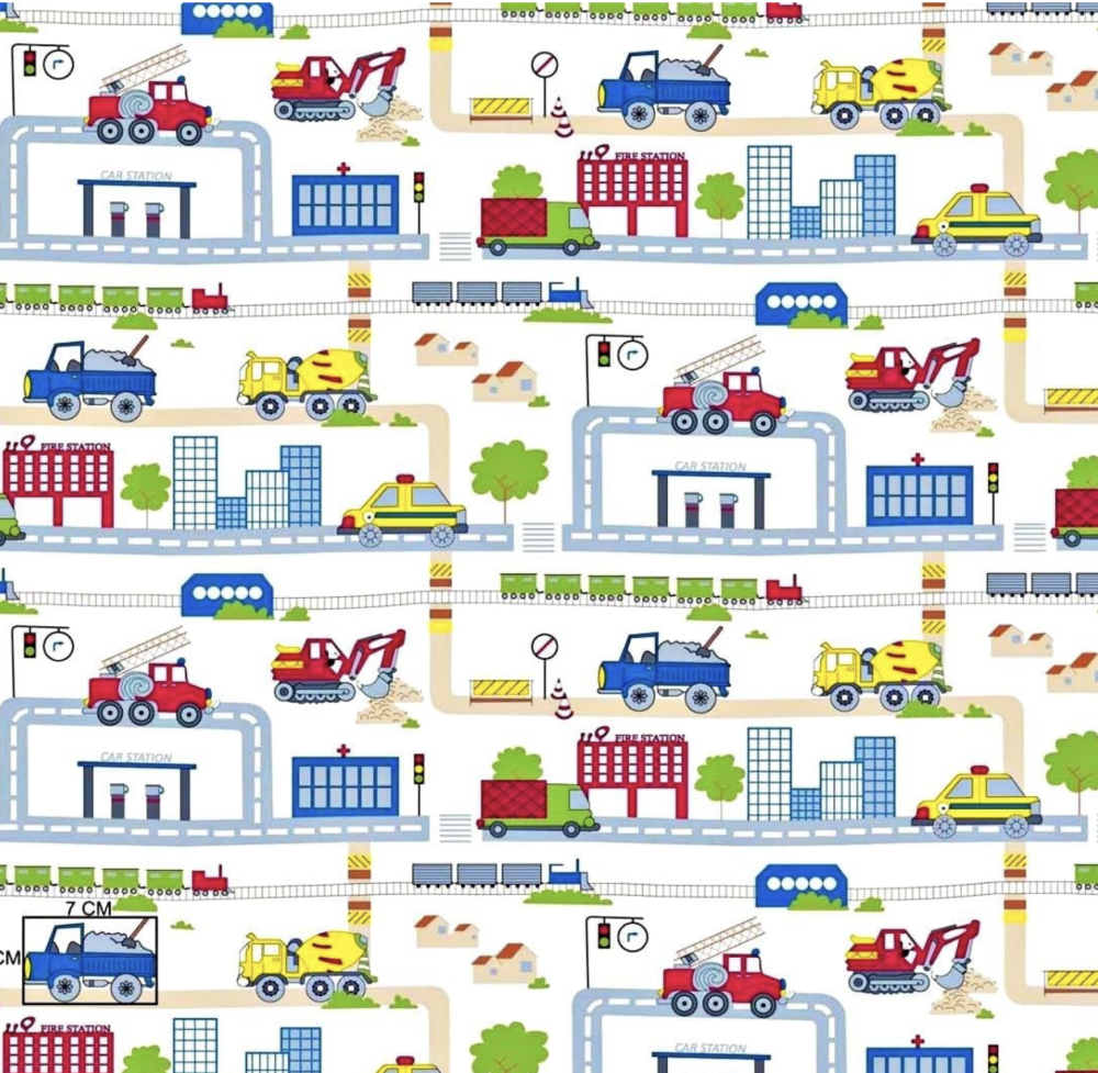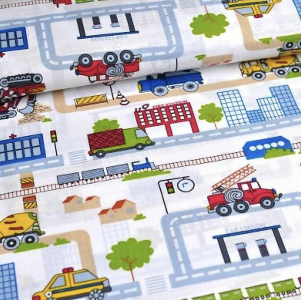 Tissu 100% coton avec des petites voitures dessus et des routes.