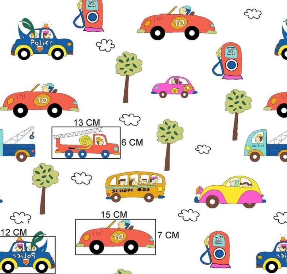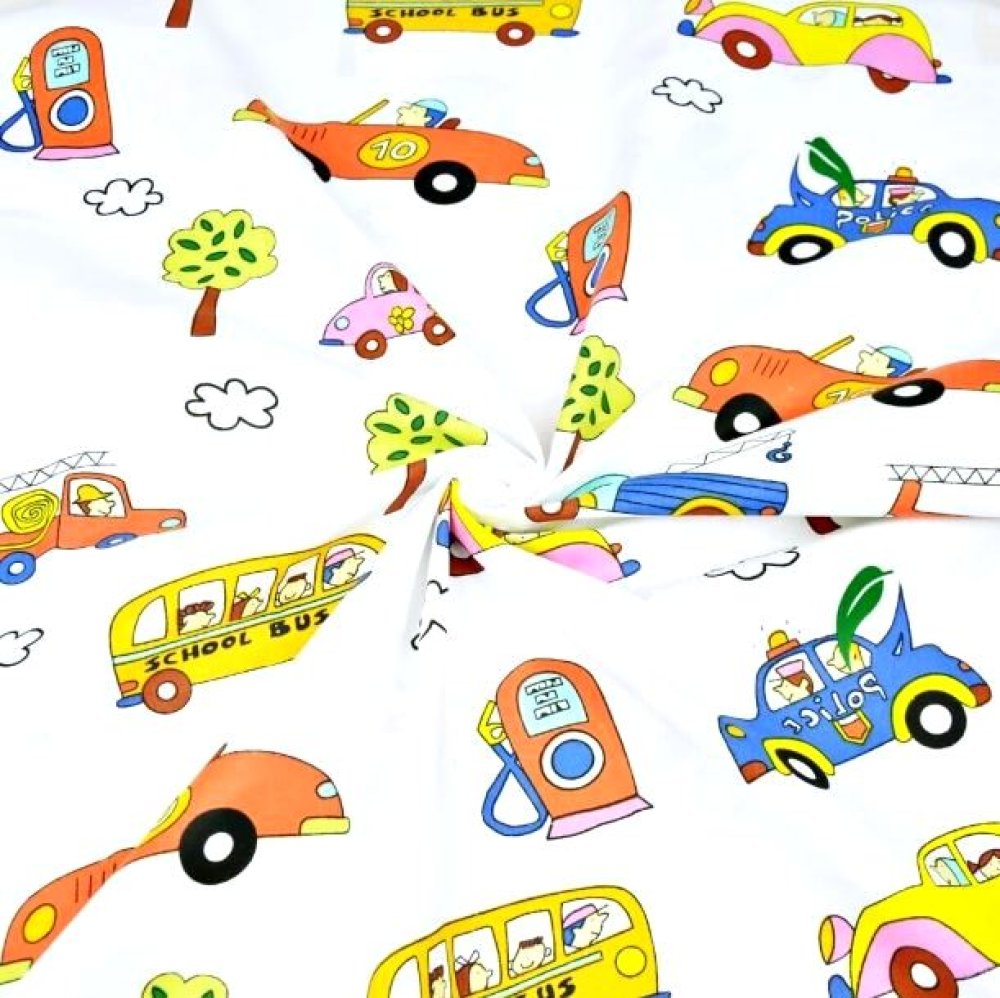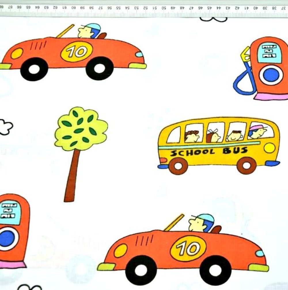 Tissu 100% coton blanc avec des petites voitures colorées à la station service