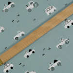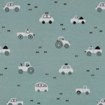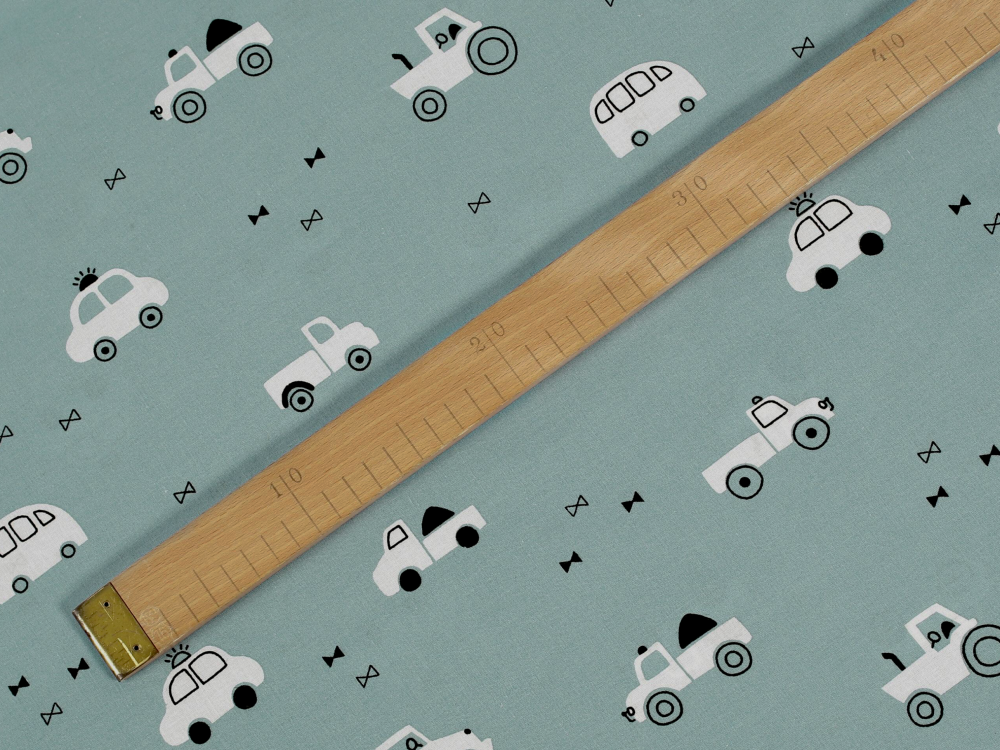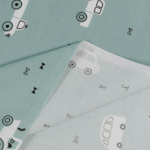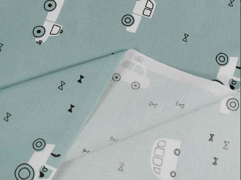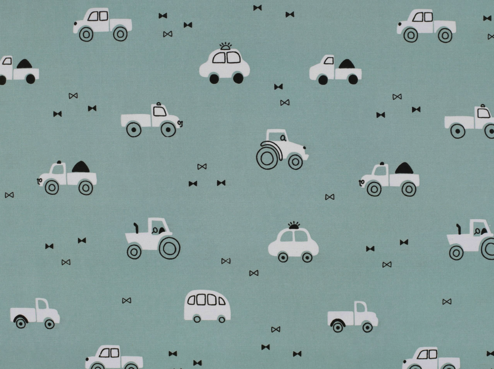 Tissu 100% coton vert sauge très tendance imprimé de voitures et camions blanc et noir