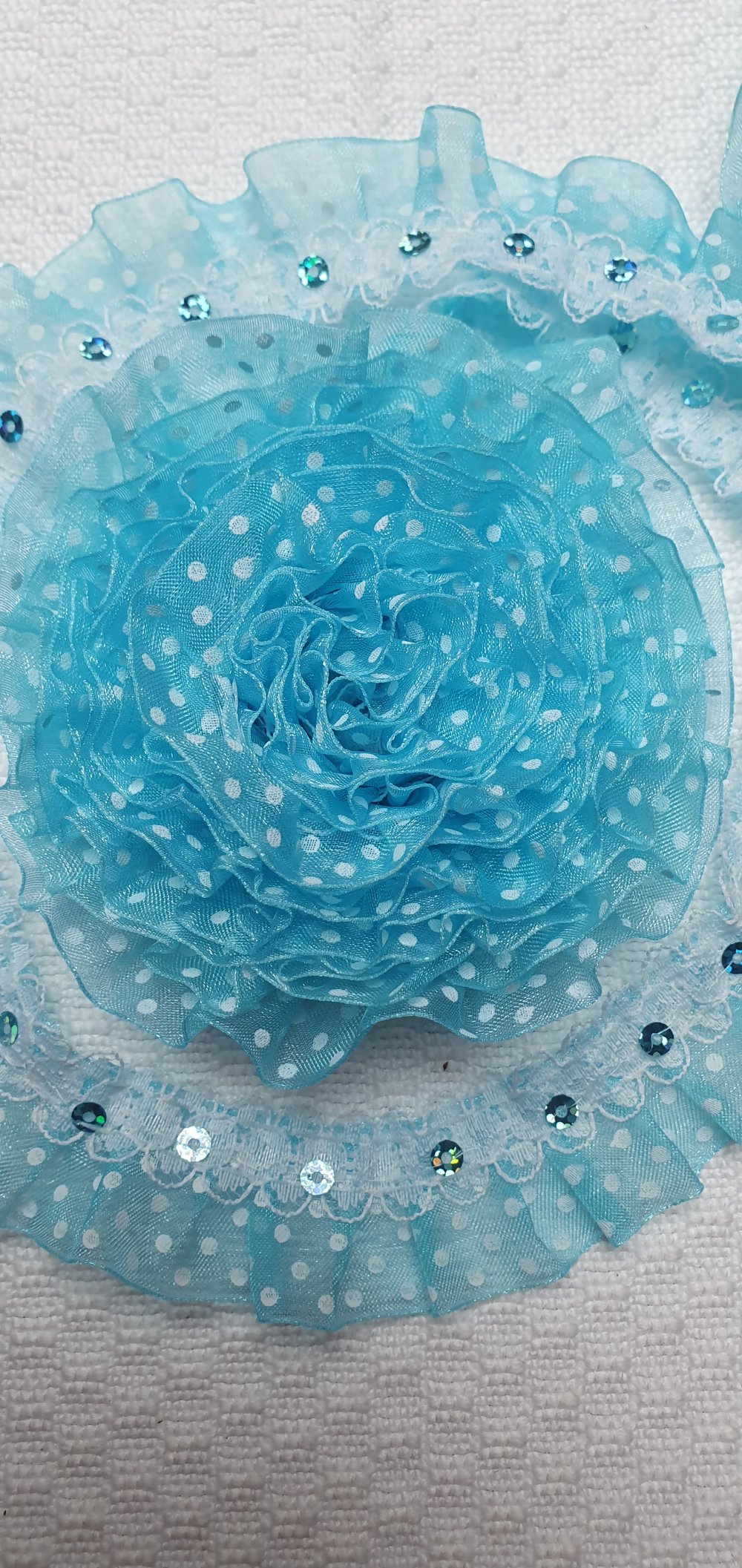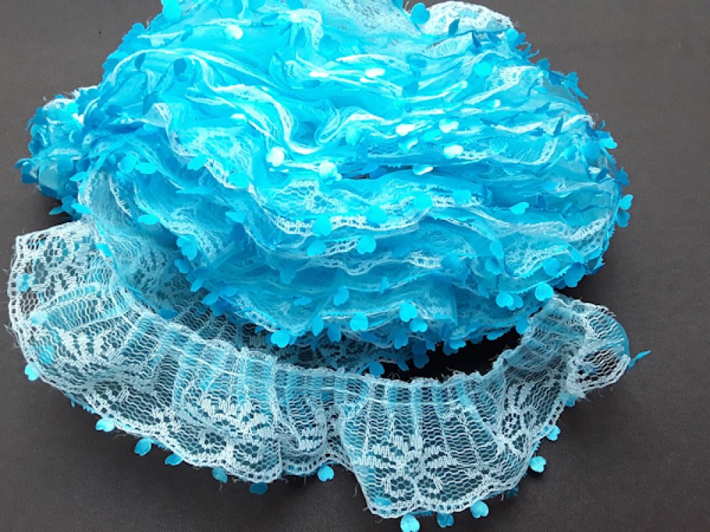 1.10m de dentelle froufrou bleue blanc 4.5cm polyester sequin. Plusieurs dentelles froufrou dans la boutique