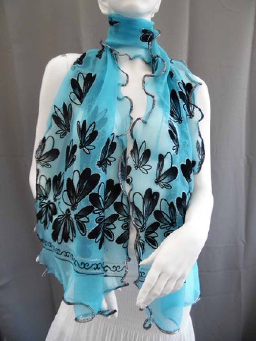 Foulard étole châle bleu et noir souple à rebord bouclé argenté polyester
