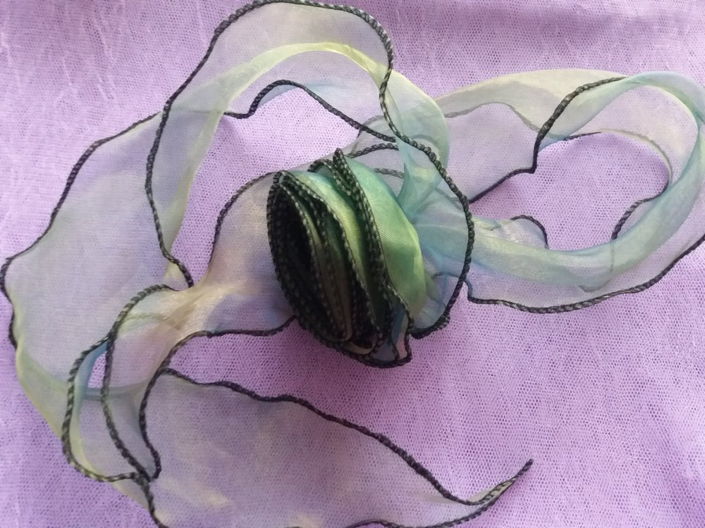 Grosse fleur en voile/organza, avec deux rubans de 50 cm x 9 cm environ chacun, couleur bleu/vert irisé, et fine cordelette au dos, pour la suspension.