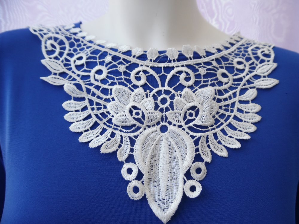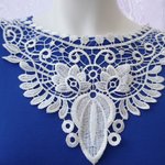Plastron blanc guipure encolure coton enduit GPB6 Largeur la plus large 22.5cm Longueur du bord supérieur au bas central 29cm. Merci de laver la guipure avant utilisation.