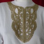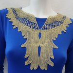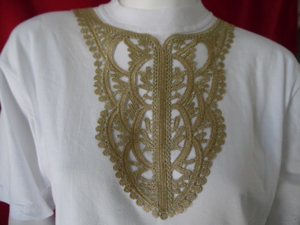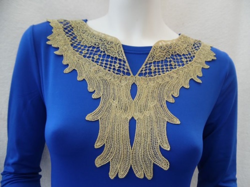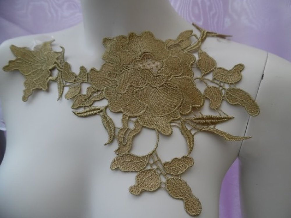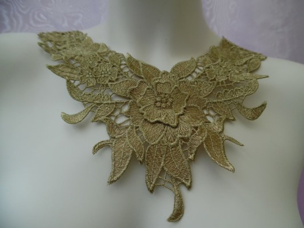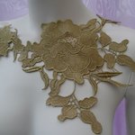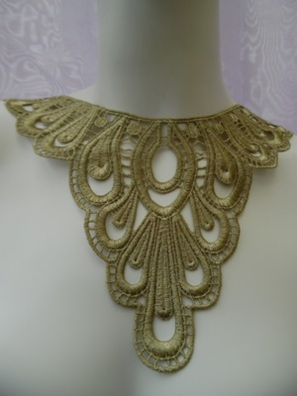 Plastron guipure doré fleur encolure dentelle fil doré GPD12 Largeur à la partie la plus large 20cm Longueur du bord supérieur au bas central 39cm. Merci de laver la guipure avant utilisation.