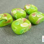 Cinq jolies perles rectangulaires, verre lampwork (petites feuilles blanc/rose/jaune/vert sur fond vert pomme opaque).