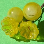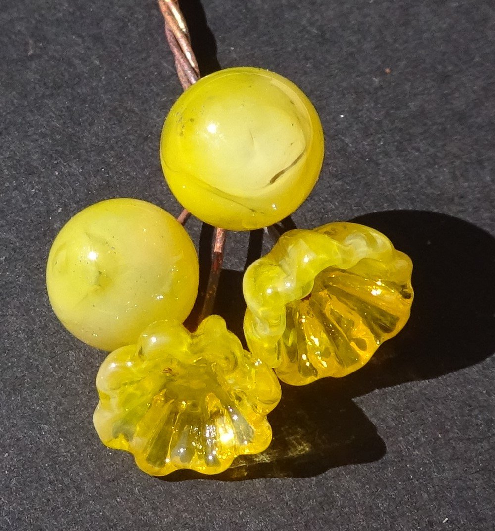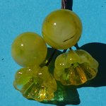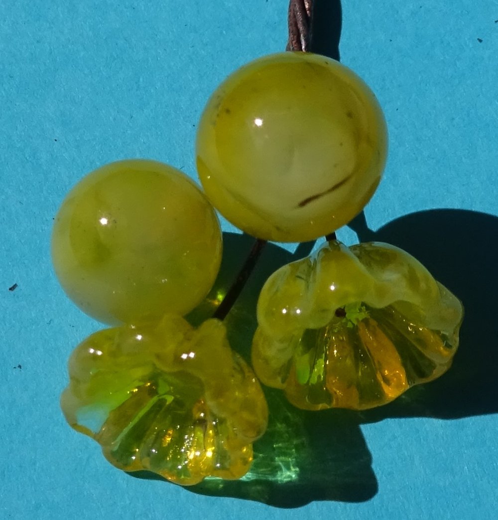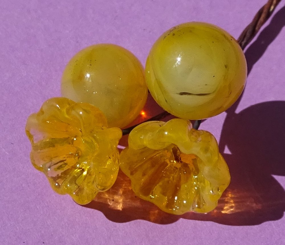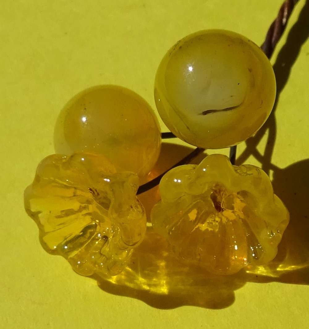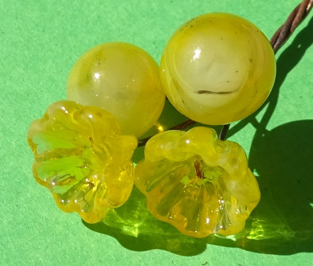 Bouquet de perles filées à la main par la créatrice, avec du verre importé de Murano (verre sodocalcique). Ce verre d'une qualité idéale présente une transparence incroyable: il est utilisé par les verriers d'art pour réaliser les plus belles pièces.