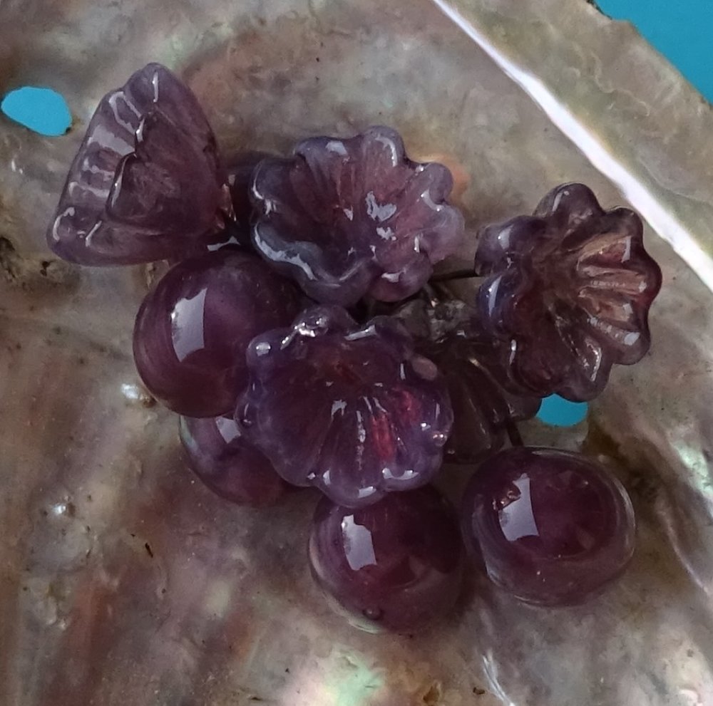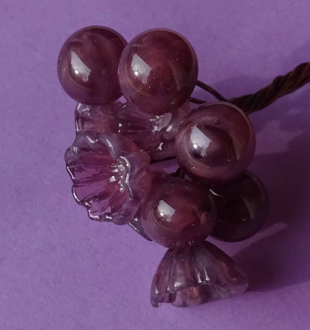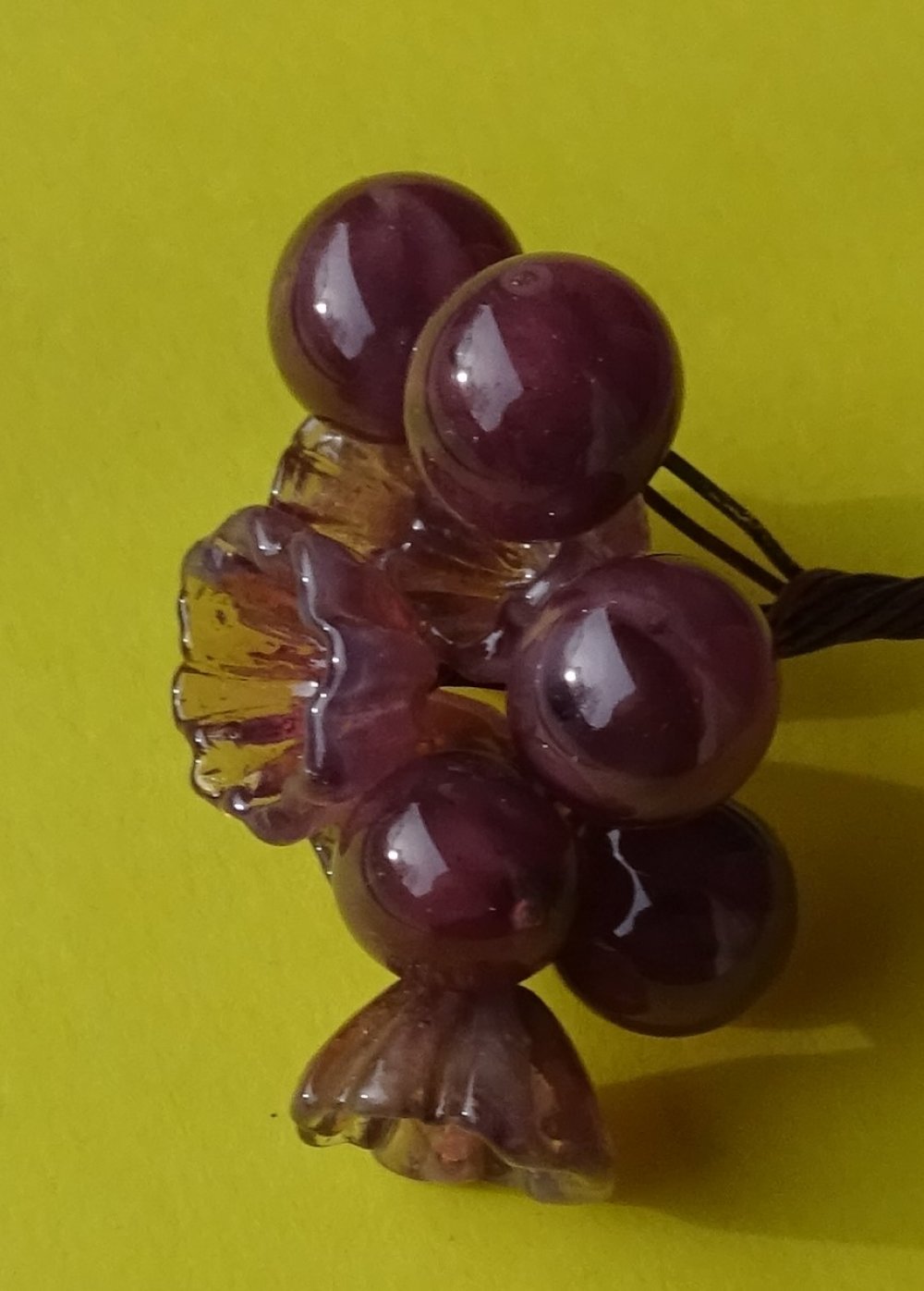 Bouquet de perles filées à la main par la créatrice, avec du verre importé de Murano (verre sodocalcique). Ce verre d'une qualité idéale présente une transparence incroyable: il est utilisé par les verriers d'art pour réaliser les plus belles pièces.