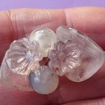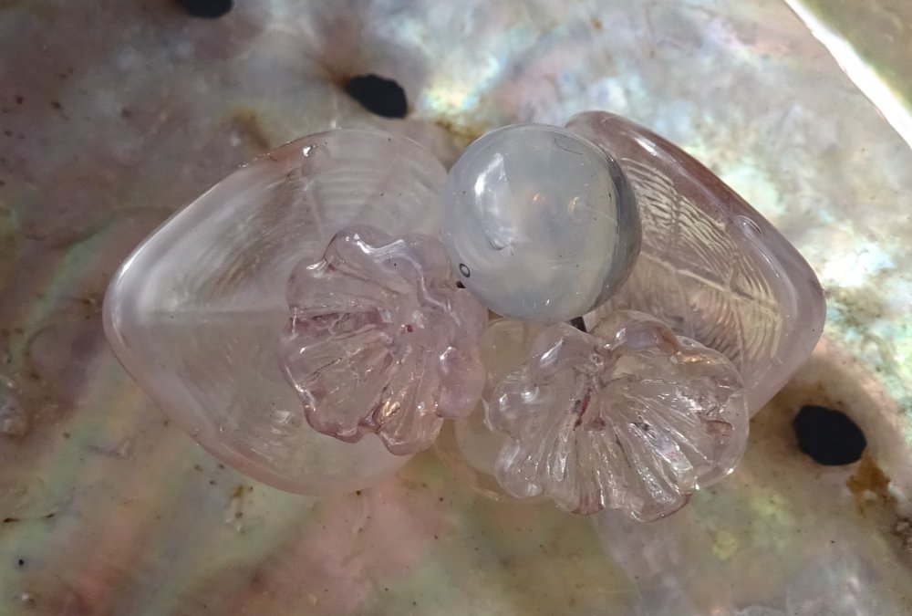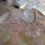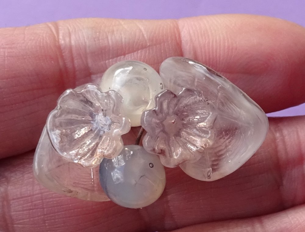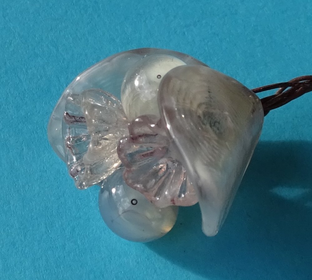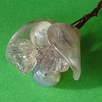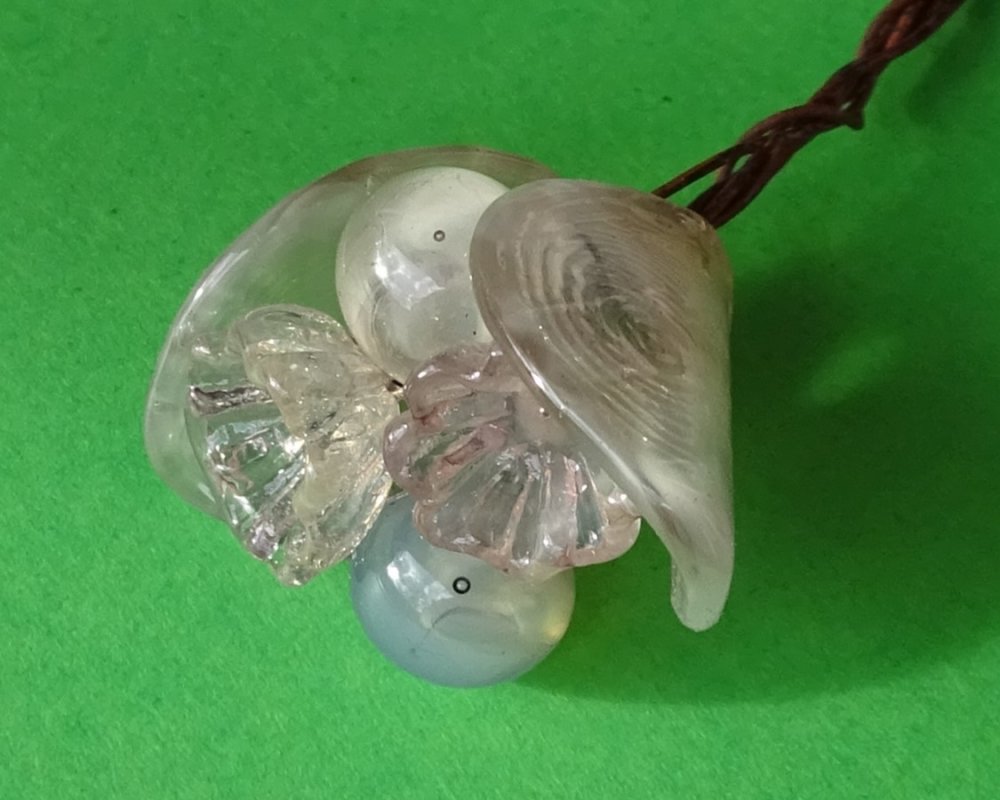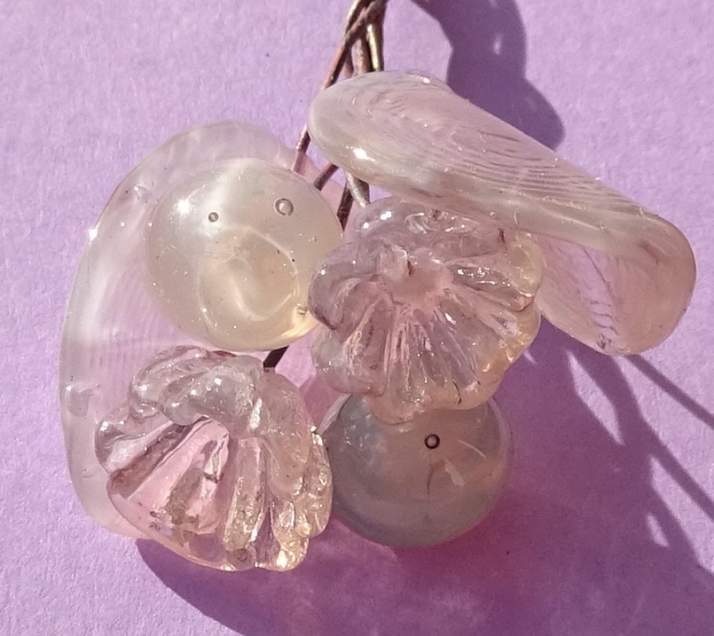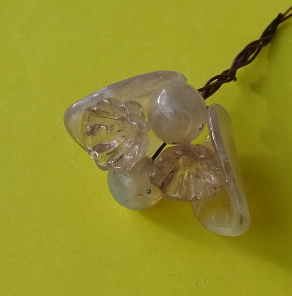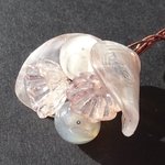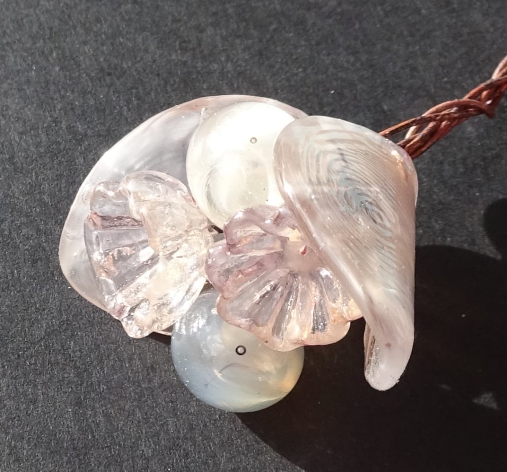 Bouquet de perles filées à la main par la créatrice, avec du verre importé de Murano (verre sodocalcique). Ce verre d'une qualité idéale présente une transparence incroyable: il est utilisé par les verriers d'art pour réaliser les plus belles pièces.