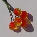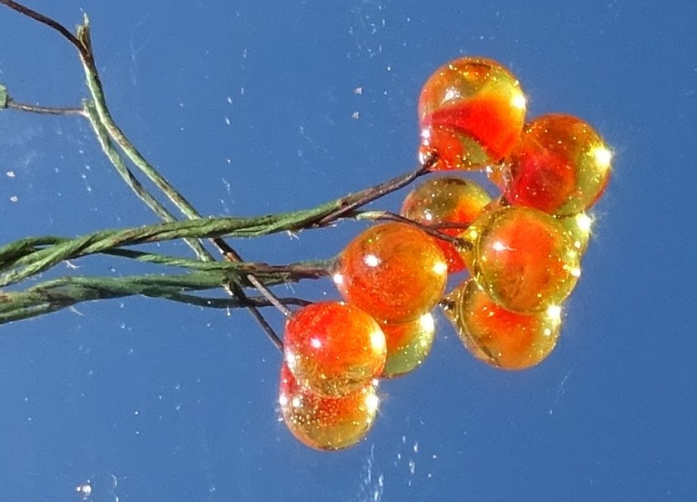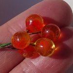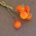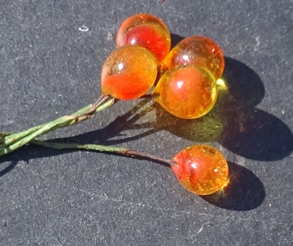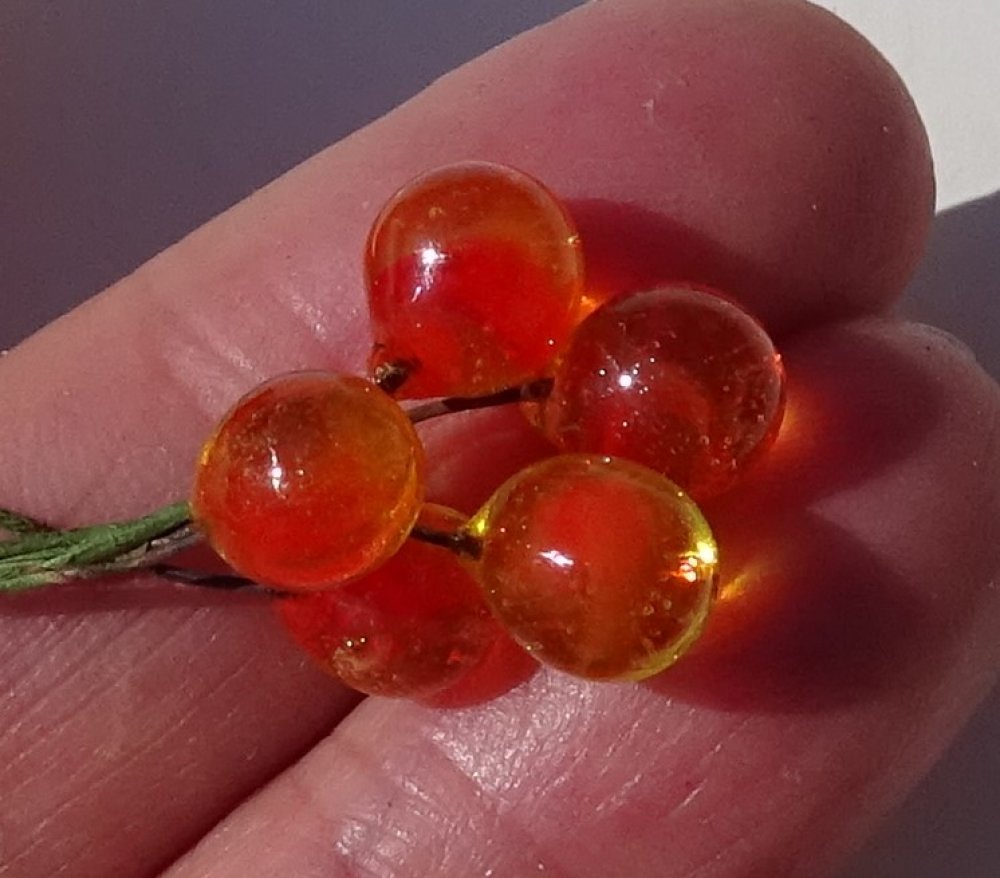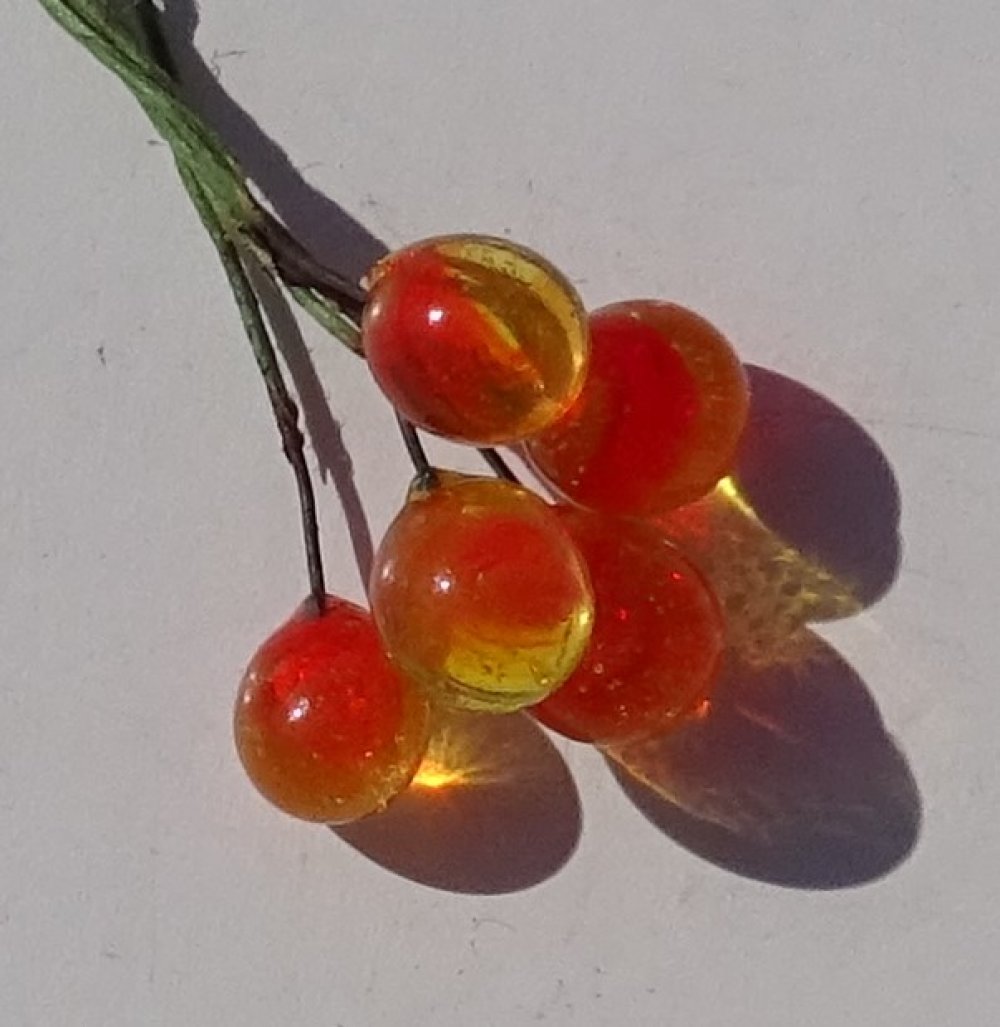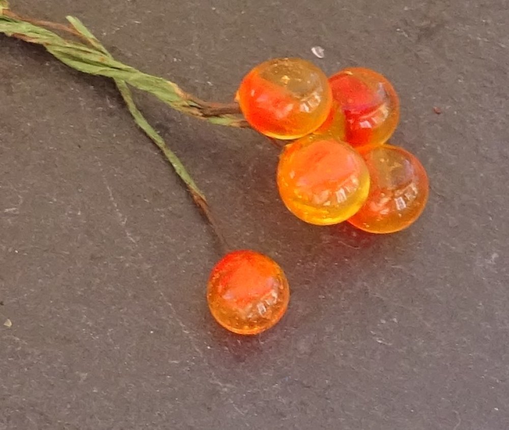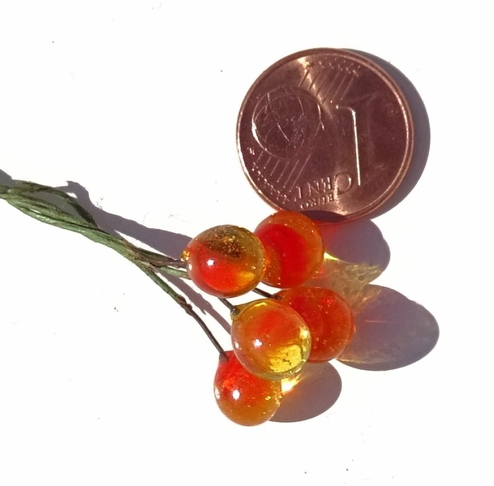 Bouquet de perles filées à la main par la créatrice, avec du verre importé de Murano (verre sodocalcique). Ce verre d'une qualité idéale présente une transparence incroyable: il est utilisé par les verriers d'art pour réaliser les plus belles pièces.