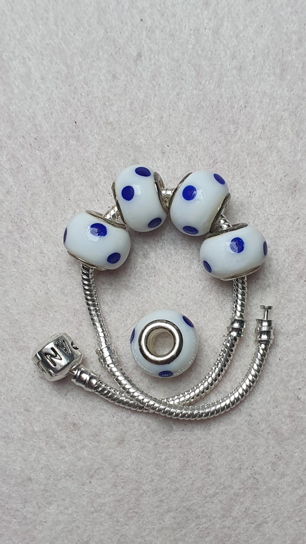 1 Perle charm blanc à pois bleu 14x10.5mm verre trou de 5mm