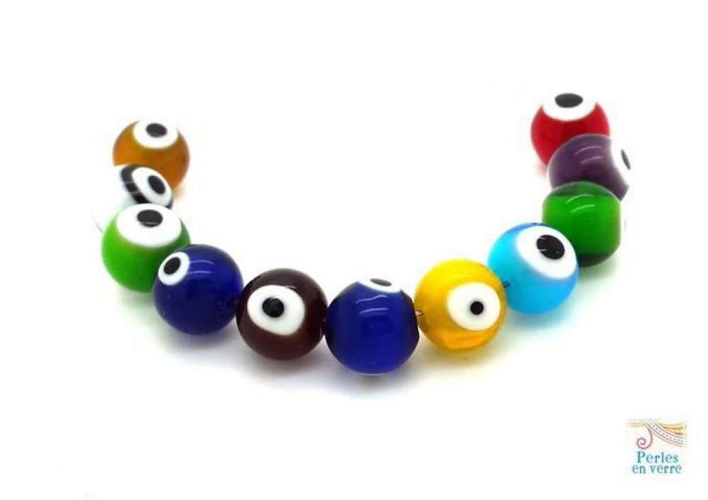 Douze perles en verre rondes, "oeil du diable", couleurs mélangées.