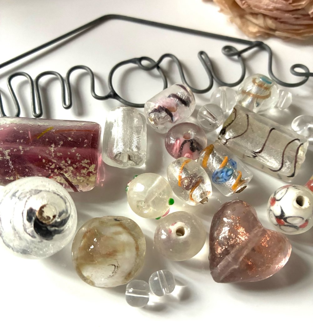 Ce lot de 20 perles en verre est composé de perles dans les tons de transparent et mauve : coeur, rond, tube, palet, de 4mm à 30mm.