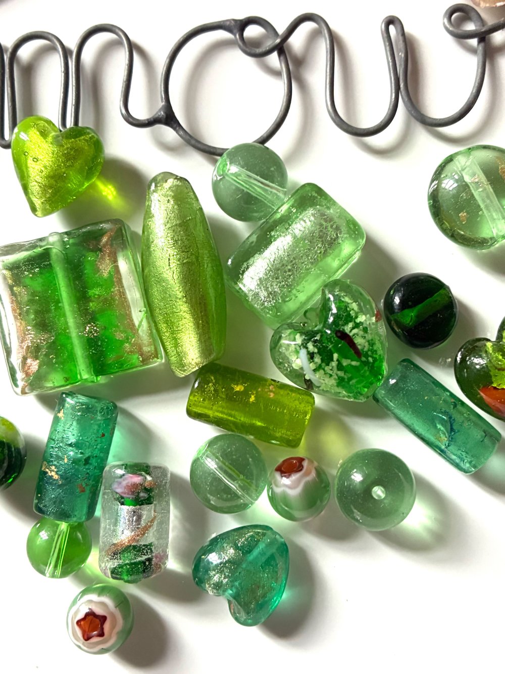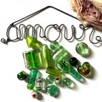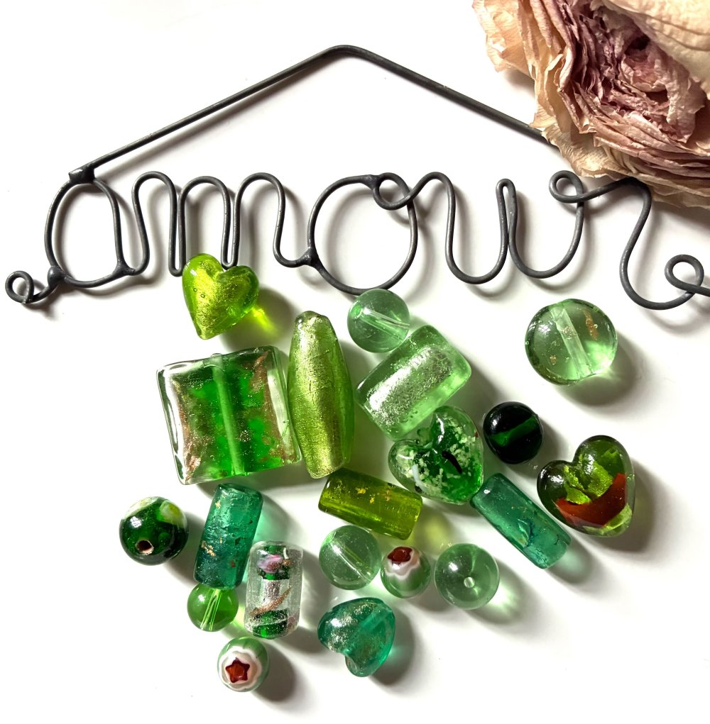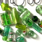 Ce lot est composé de 20 perles en verre dans les différents tons de vert : coeur, rond, tube, pour des créations originales.
