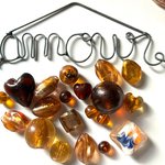 Ce lot est composé de 20 perles en verre et en doré et marron : rond, coeur, torsade, palet.