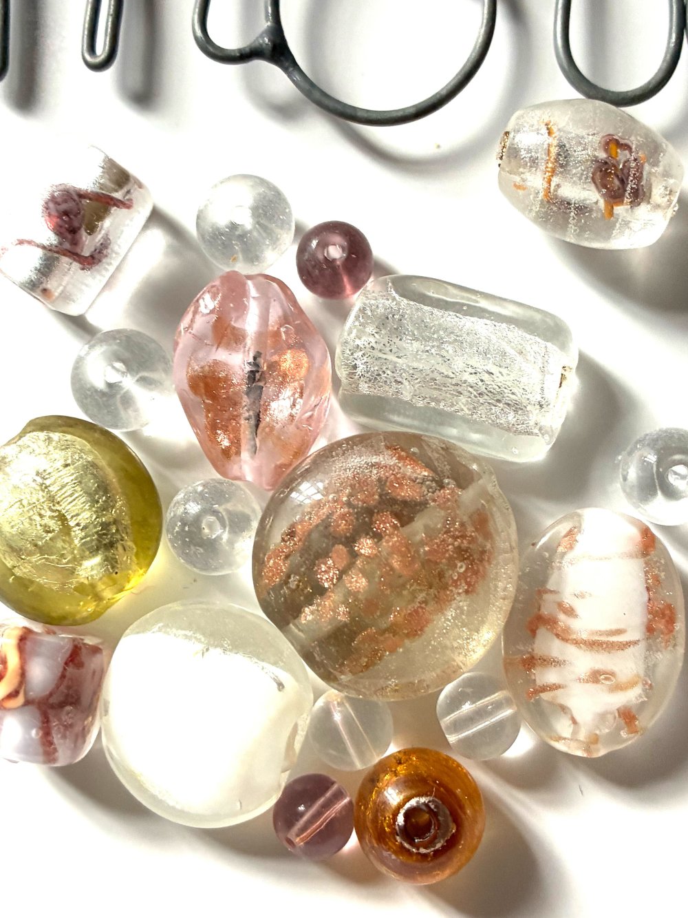 Ce lot est composé de 20 perles en verre et en doré , blanc, rose et vert, forme variée : rond, palet, rectangle, torsade.