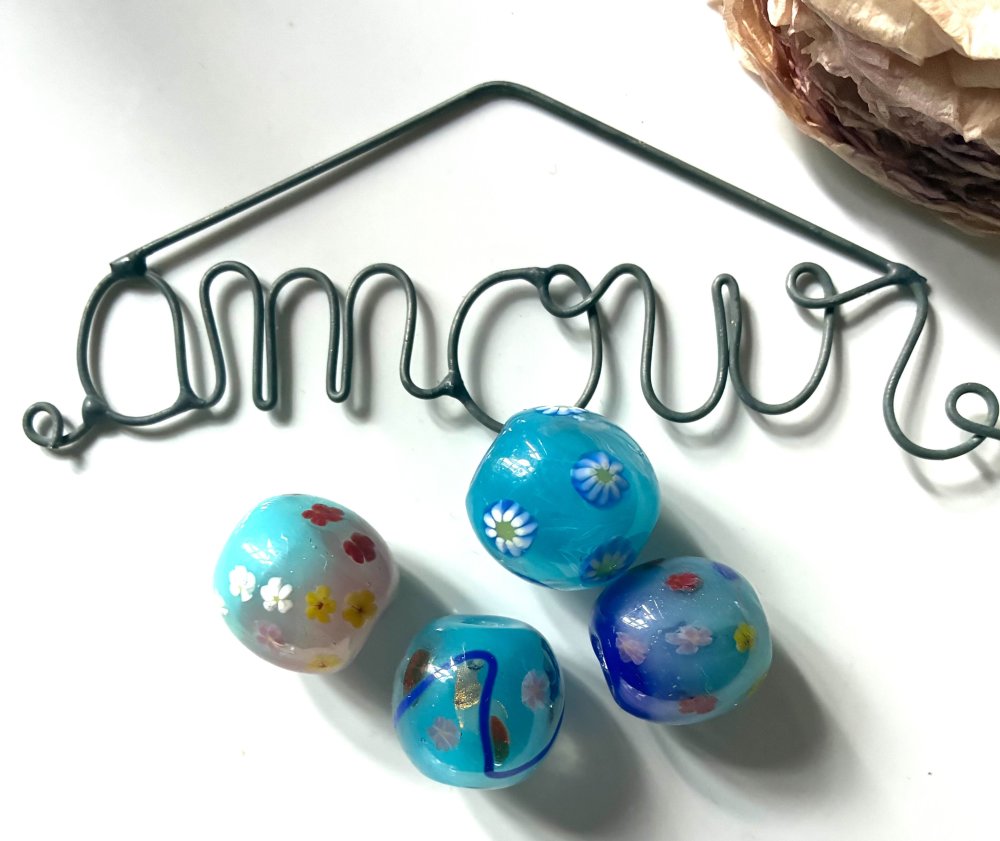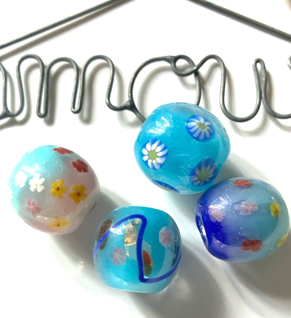 Ce lot est composé de 4 perles en verre de 20 mm de diamètre décor fleurs incrustées.