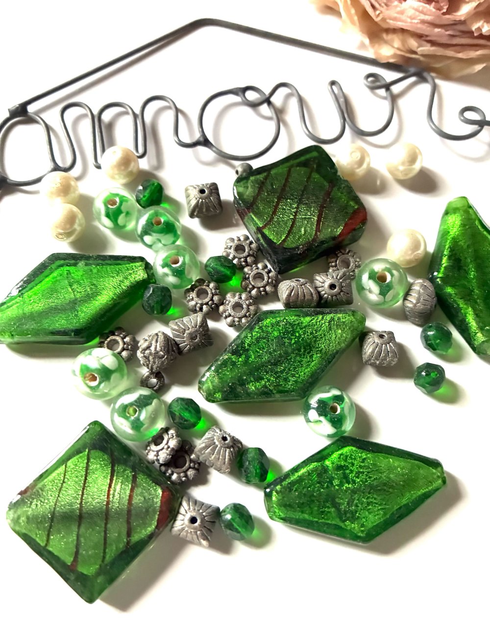 Ce lot est composé de 30 perles en verre dans les différents tons de vert :