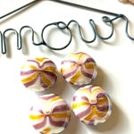 Ce lot est composé de  perles palets en verre avec des rayures en violet, blanc et orange. Diamètre = mm.