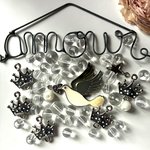 Ce lot est composé de 43 perles rondes transparentes, de 4mm et 6mm et de 7 breloques métal et époxy en argenté et gris : couronnes, étoile et oiseau.
