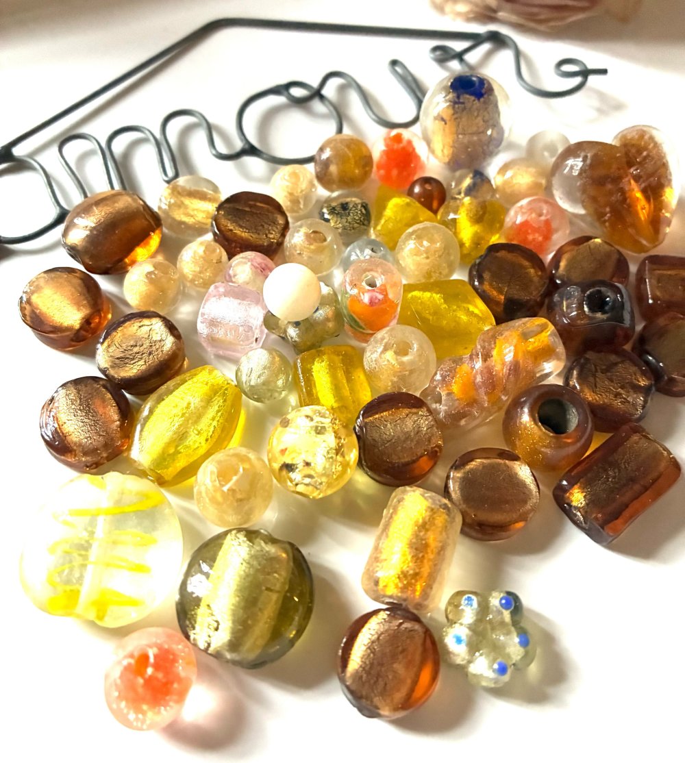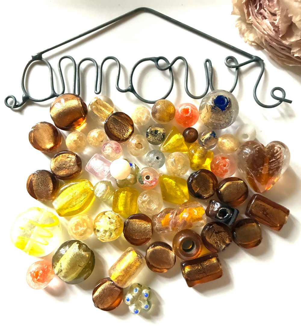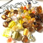 Ce lot est composé de 50 perles en verre, formes et couleurs variées : rond, carré, olive, palet, tube.