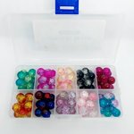 Boîte contenant environ 100 à 105 perles rondes en verre craquelé. Environ 10 perles par couleurs