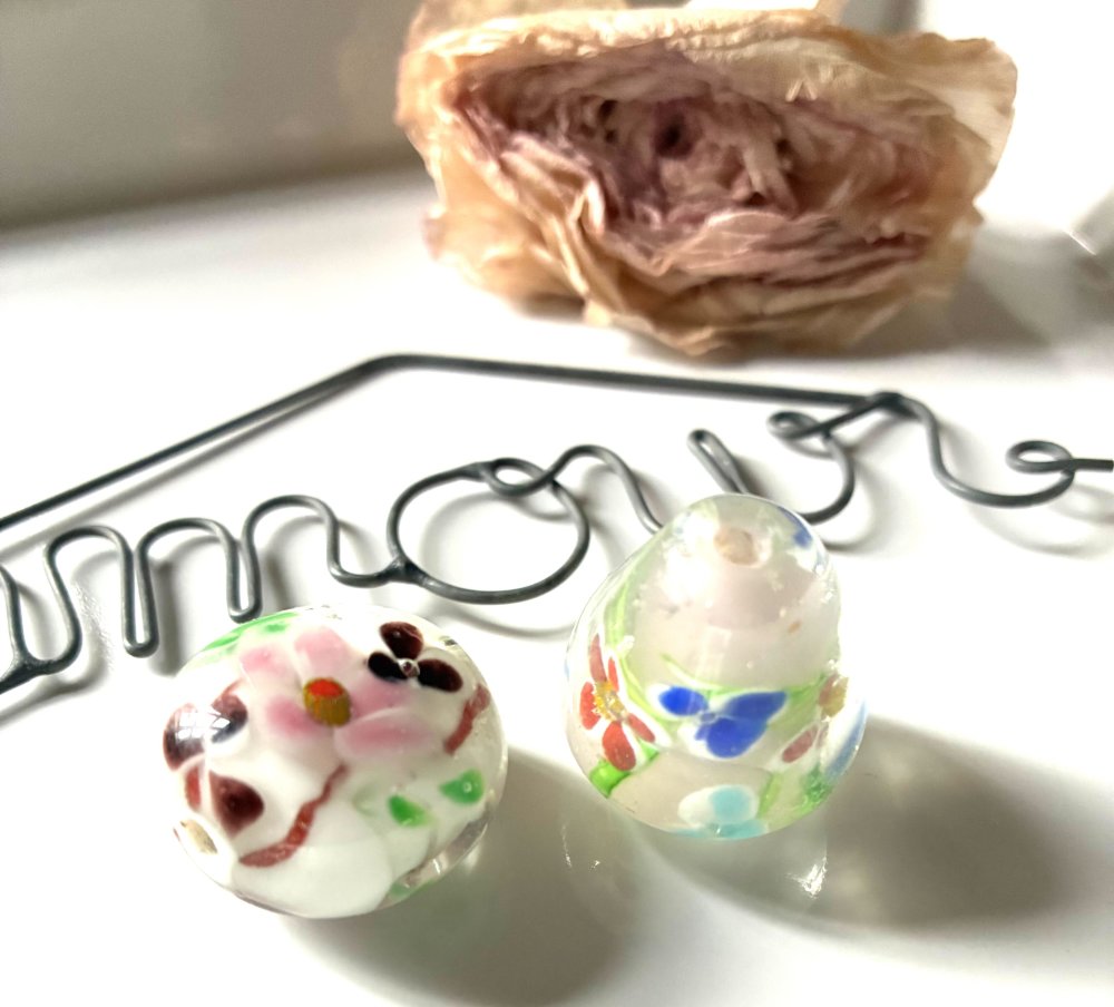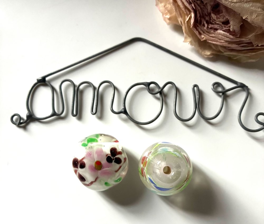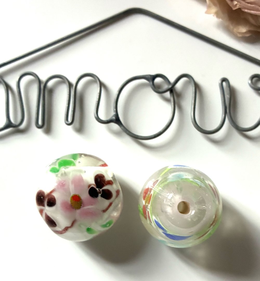 Ce lot est composé de deux perles en verre avec inclusion de fleurs : une forme poire qui mesure 25mmx18mm, percée de haut en bas transparente et opaque blanche avec fleurs bleues ou rouges et 1 ronde de 23mm transparente et blanche avec fleurs rouge foncé et verte.