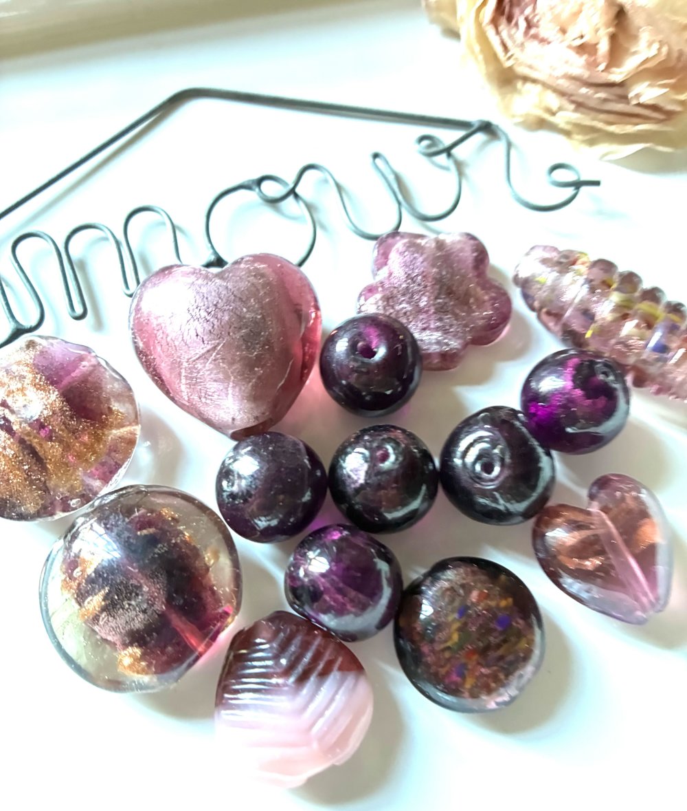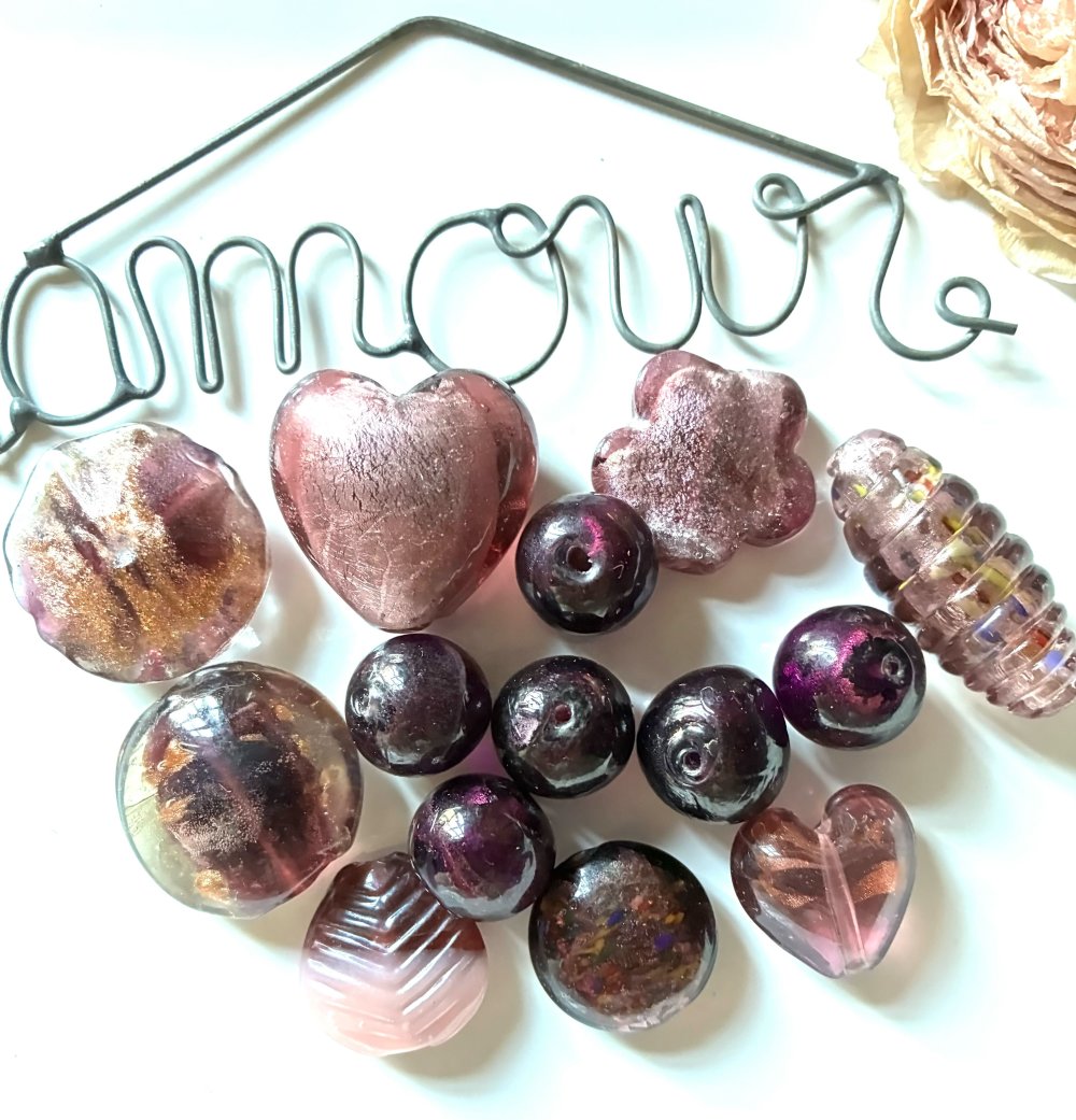 Ce lot est composé de 14 perles en verre, un assortiment forme coeur, rond, palet, tube  dans les tons de violet et rose.