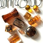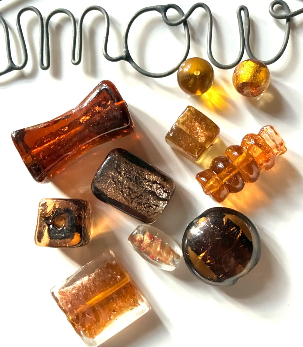 Ce lot est composé de 10 perles en verre dans les tons de marron et doré, en forme de tube ou rondes ou spirale ou palet