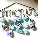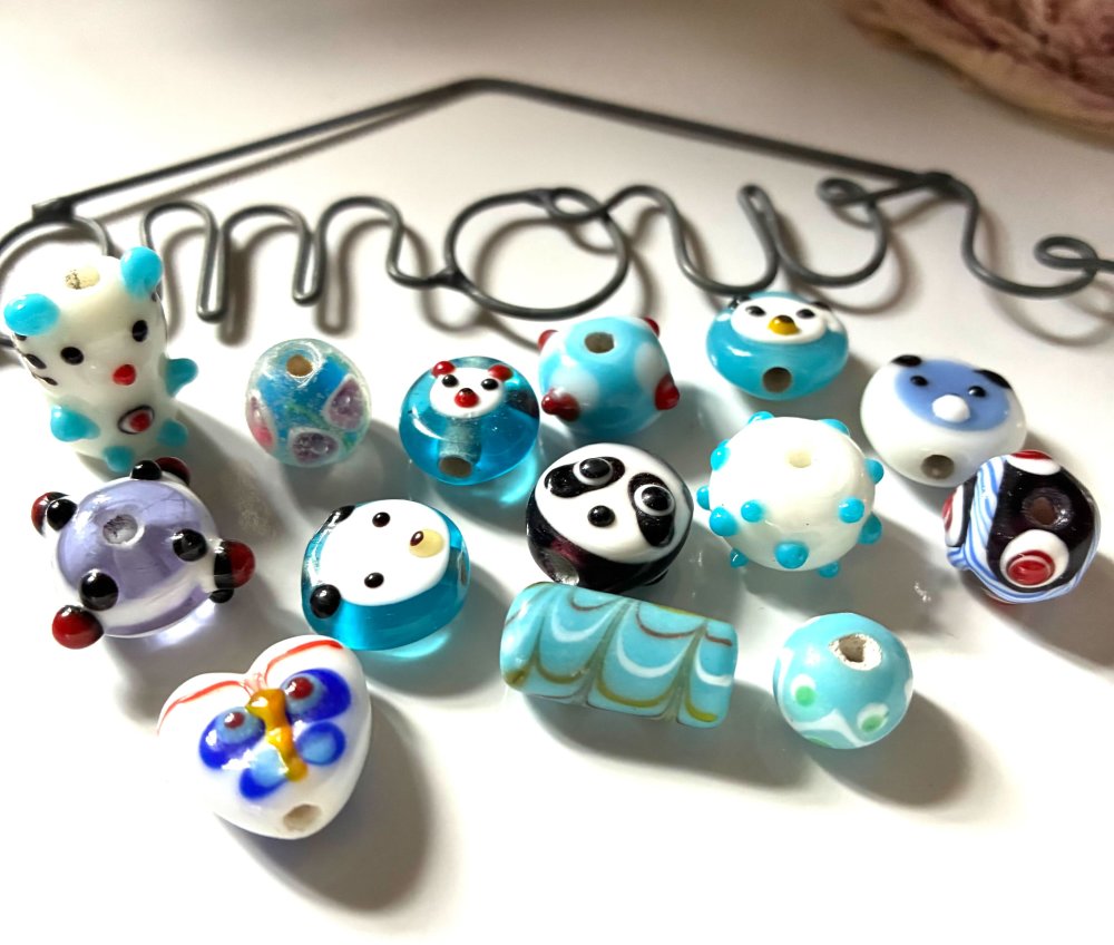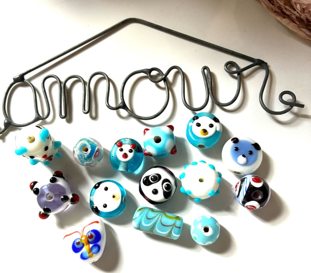 Ces 14 perles en verre bleues et blanches sont de formes et tailles variées (oursons, chat, cour), de 5 mm à 1,5cm.