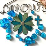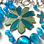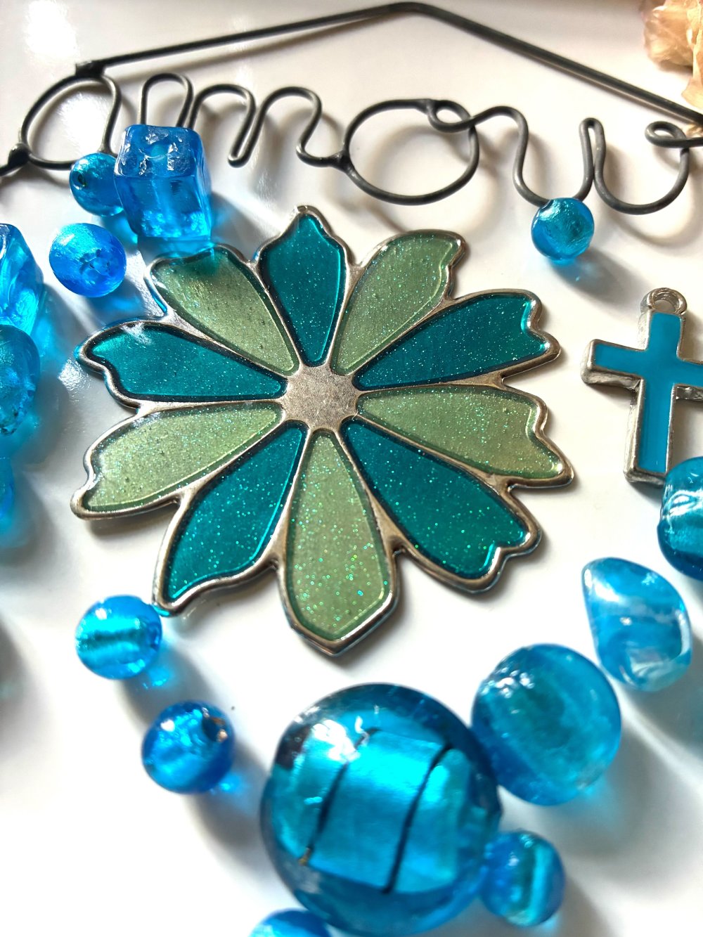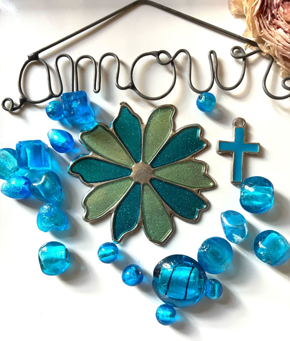 Ce lot est composé de 20 perles en verre et époxy dans les tons de bleu et turquoise formes variées : coeur, ronds, cubes et grande fleur en époxy (6cm).