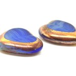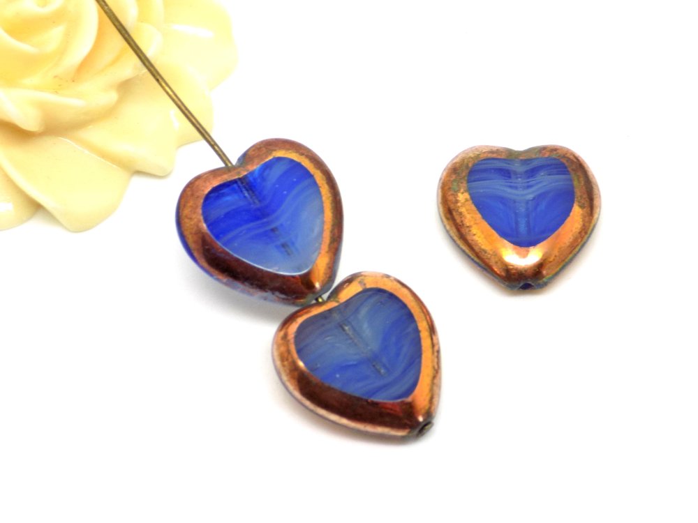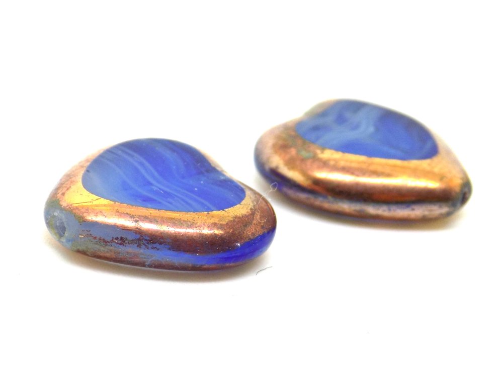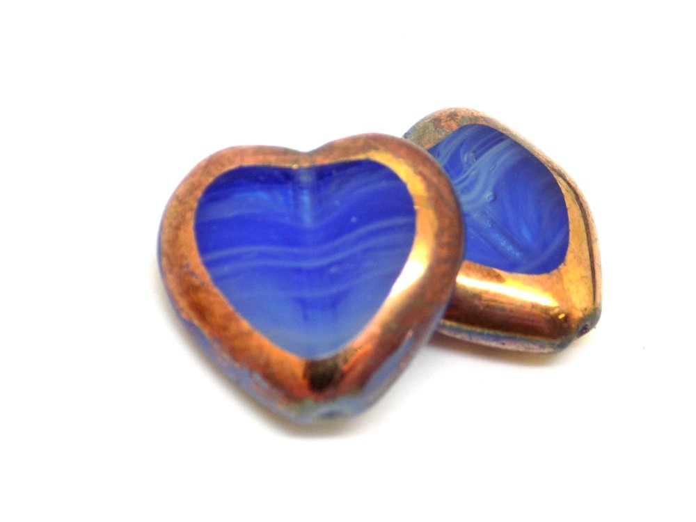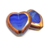 Perle tchèque coeur, verre pressé translucide, bleu effet vague, couleur cuivré, 16 x 15 mm, lot de 2