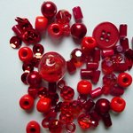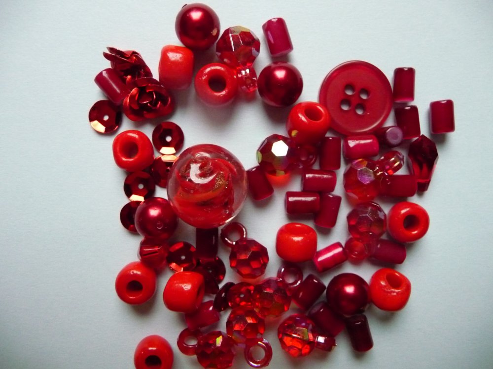 Je vous propose un assortiment de perles, couleur rouge, composé de perles en céramique, verre, plastique, certaines avec aspect nacré, irisé, formes rondes, cylindriques, fleurs métallisées, quelques paillettes.