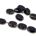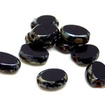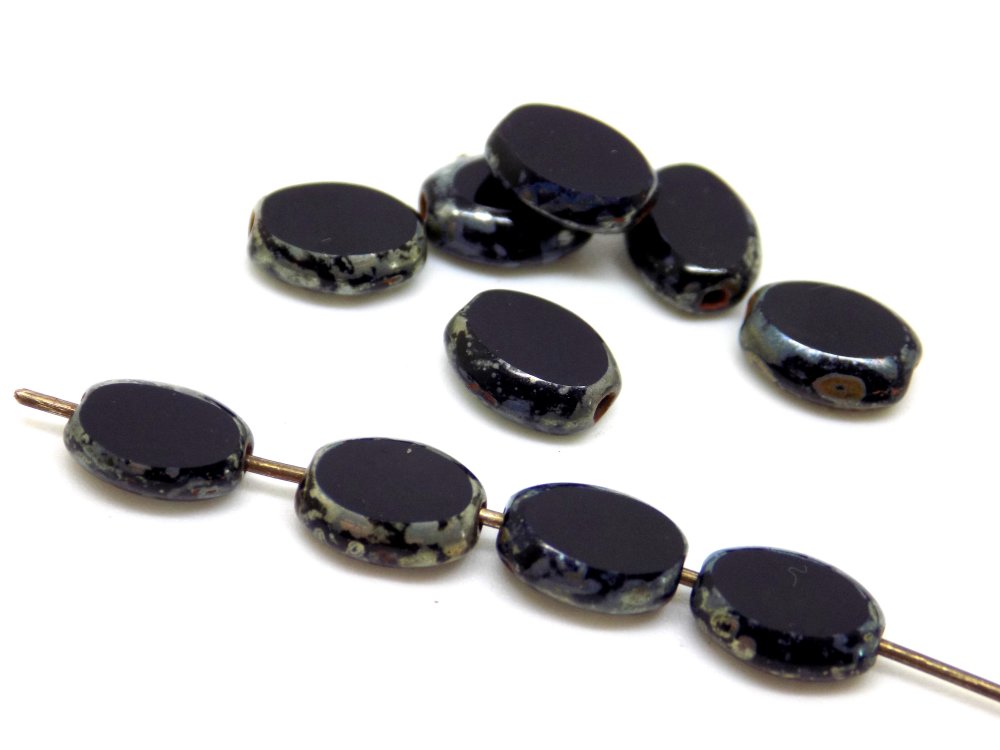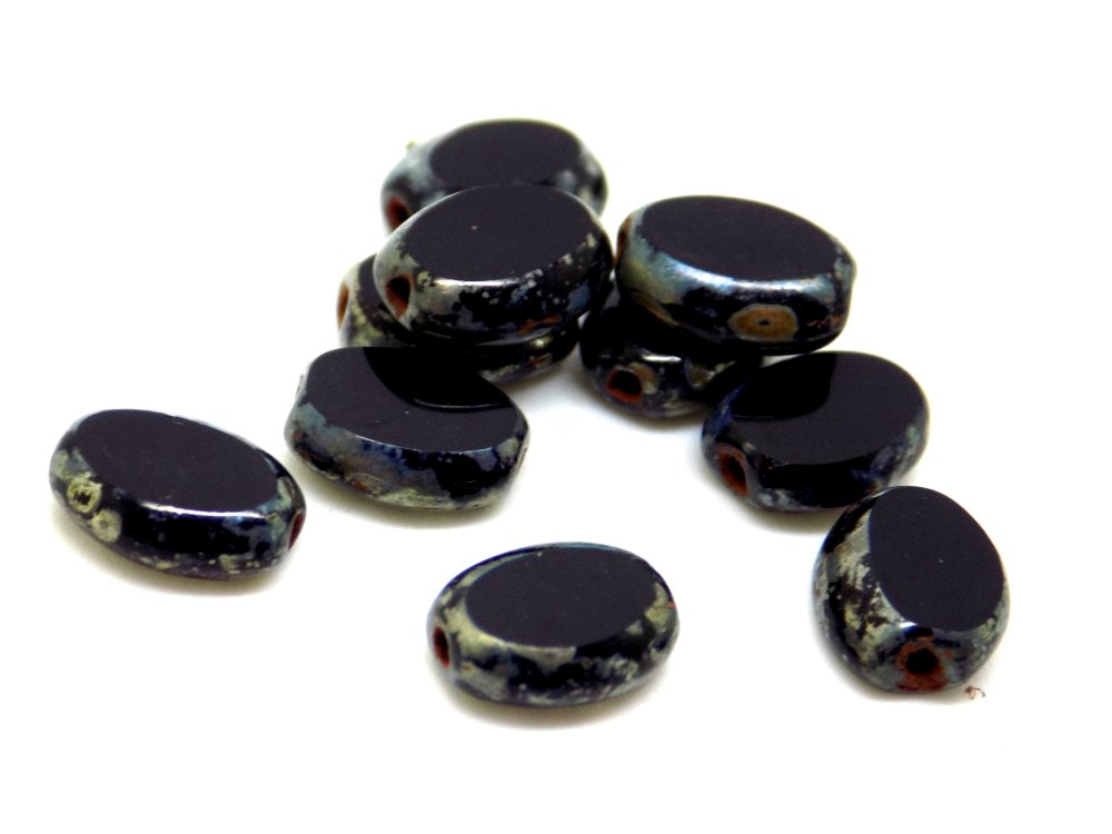 Perles tchèques ovales et plates, verre pressé, noir, contour tons gris, noir, marron, patine, 8 x 6 mm, lot de 10