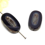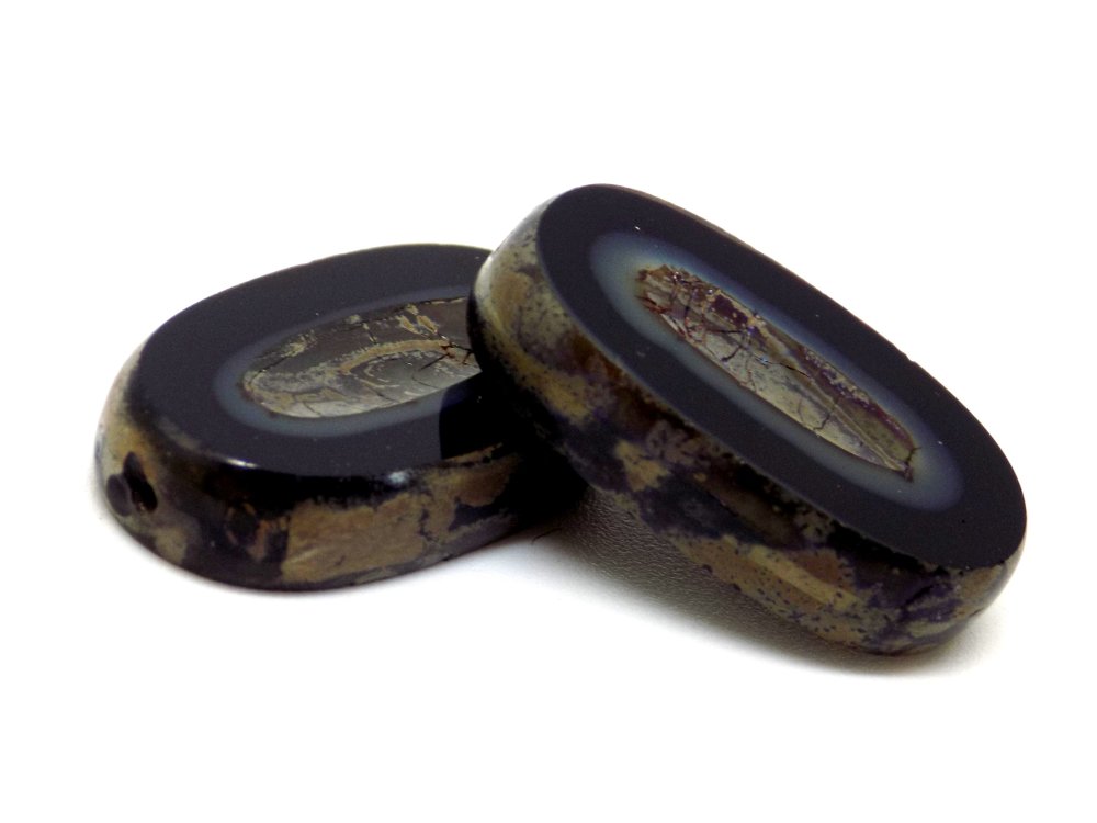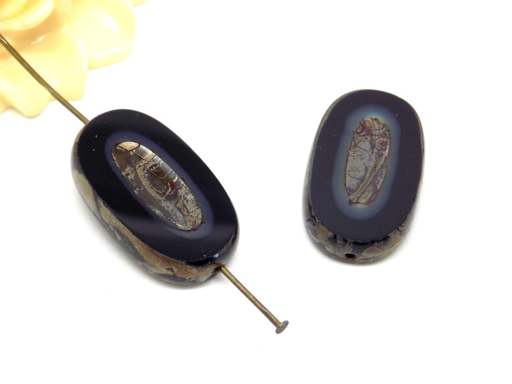 Perles tchèques ovales, verre pressé, picasso, noir, marron clair, gris, effet craquelé, style antique, patine, 21 x 12 mm, lot de 2