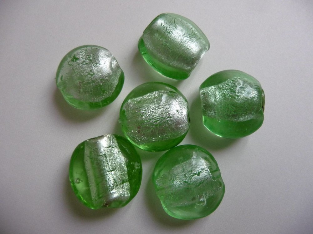 2 EME CHOIX pour cet assortiment de 6 perles en verre, couleur verte, avec feuille d'argent, diamètre 17 mm, 7 à 8 mm d'épaisseur.