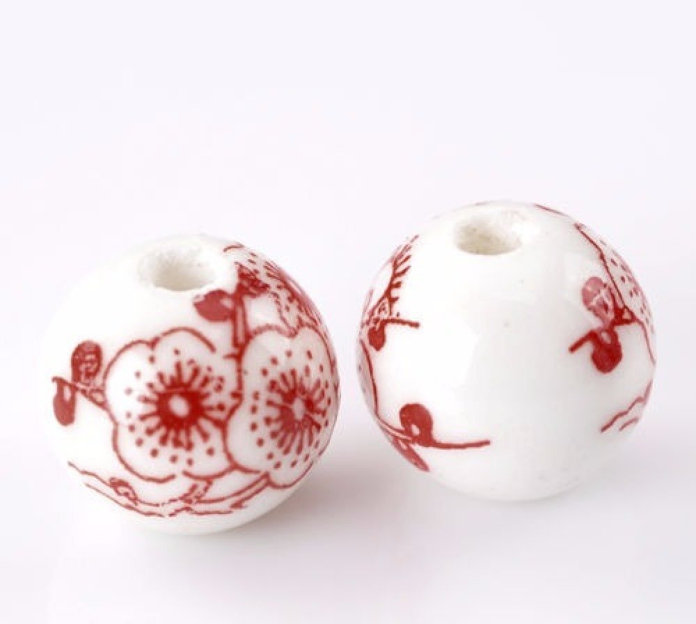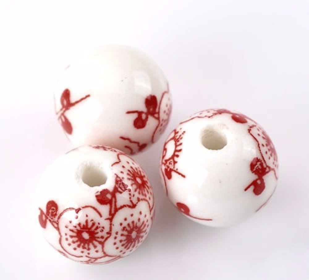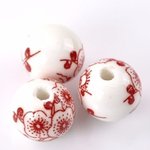 ce très beau lot de 6 perles intercalaires de forme ronde en céramique à motif fleur ton rouge sur fond blanc.