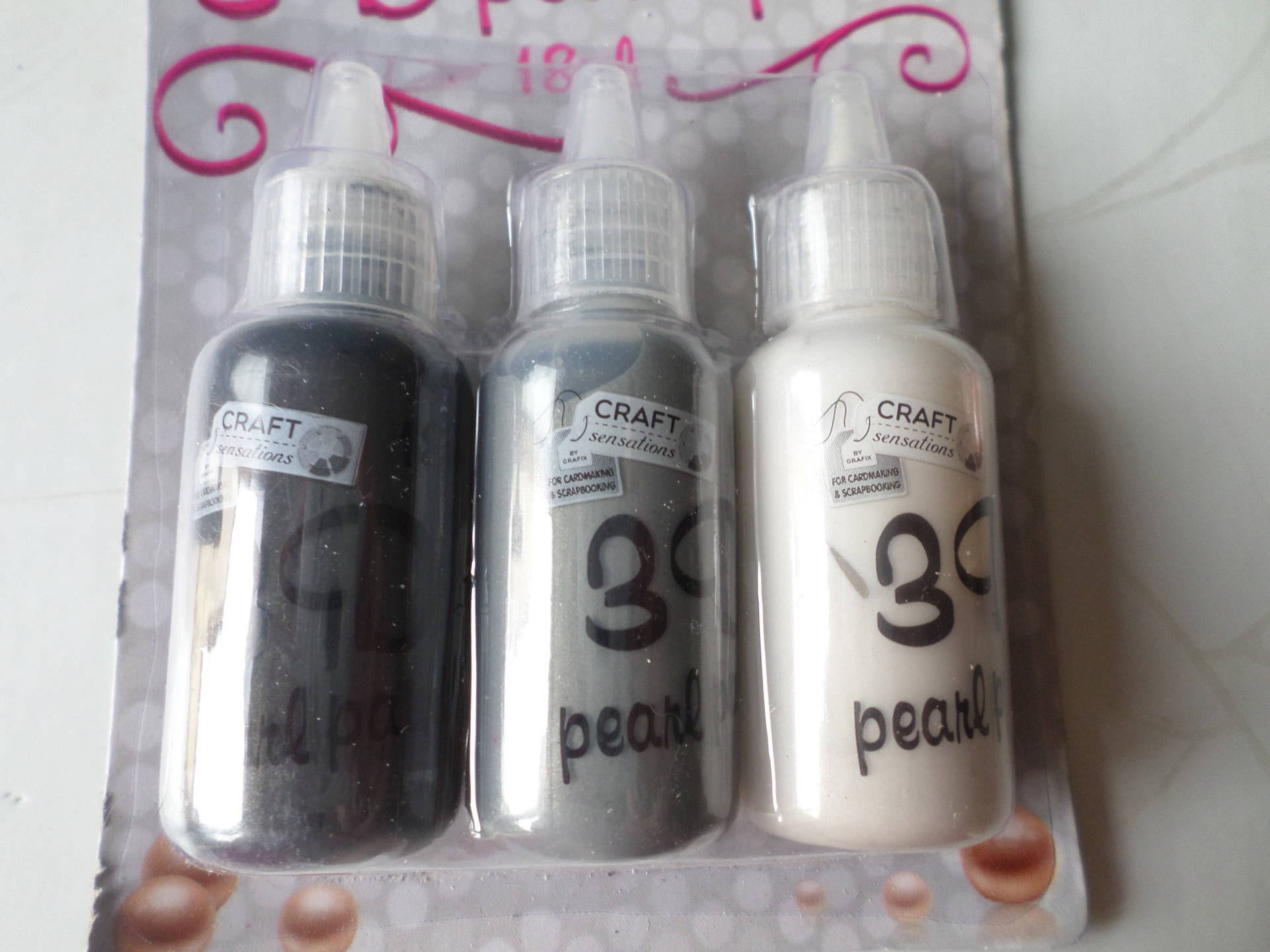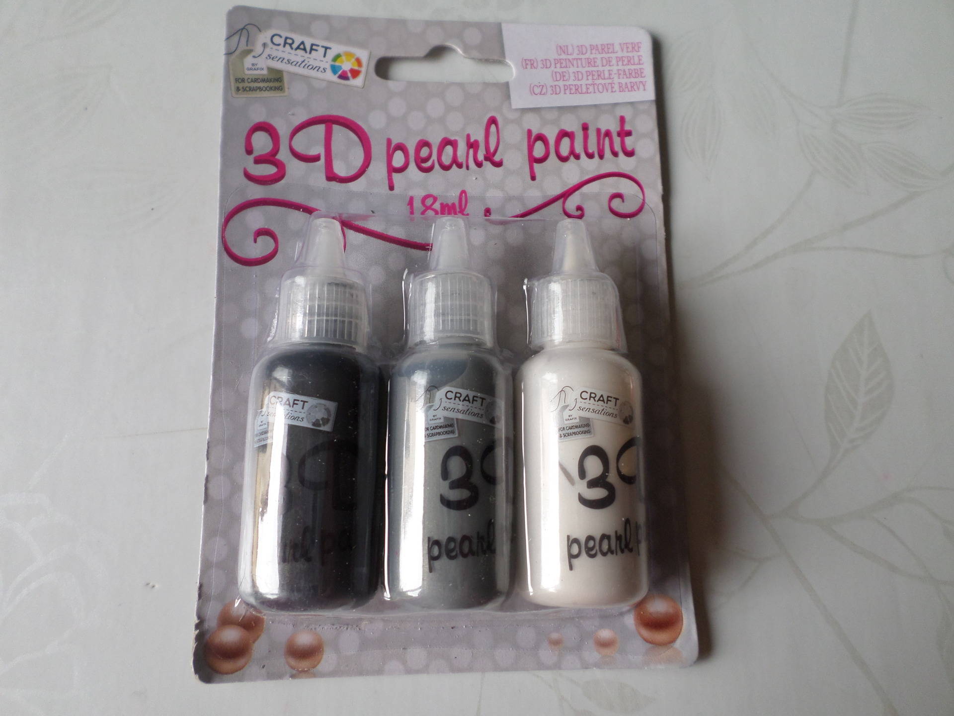 ce très beau lot de 3 mixte flacons de peinture 3D effet perle nacré de 3 couleurs différentes: noir/gris foncé/blanc.